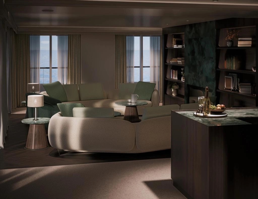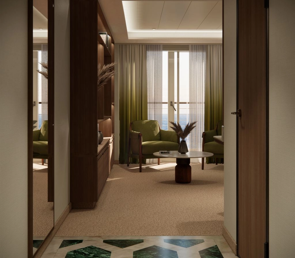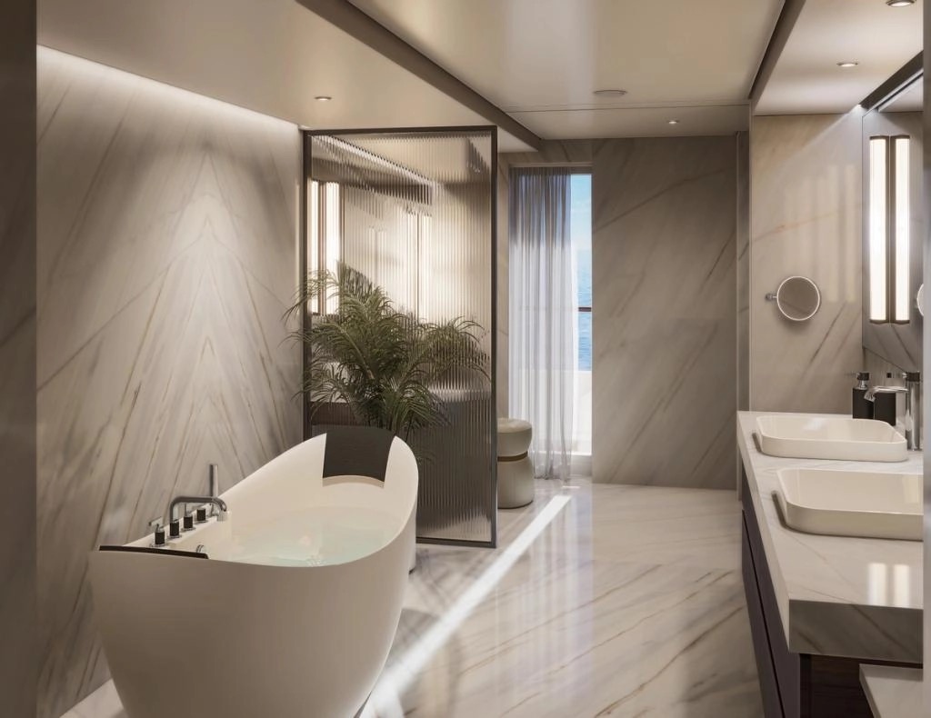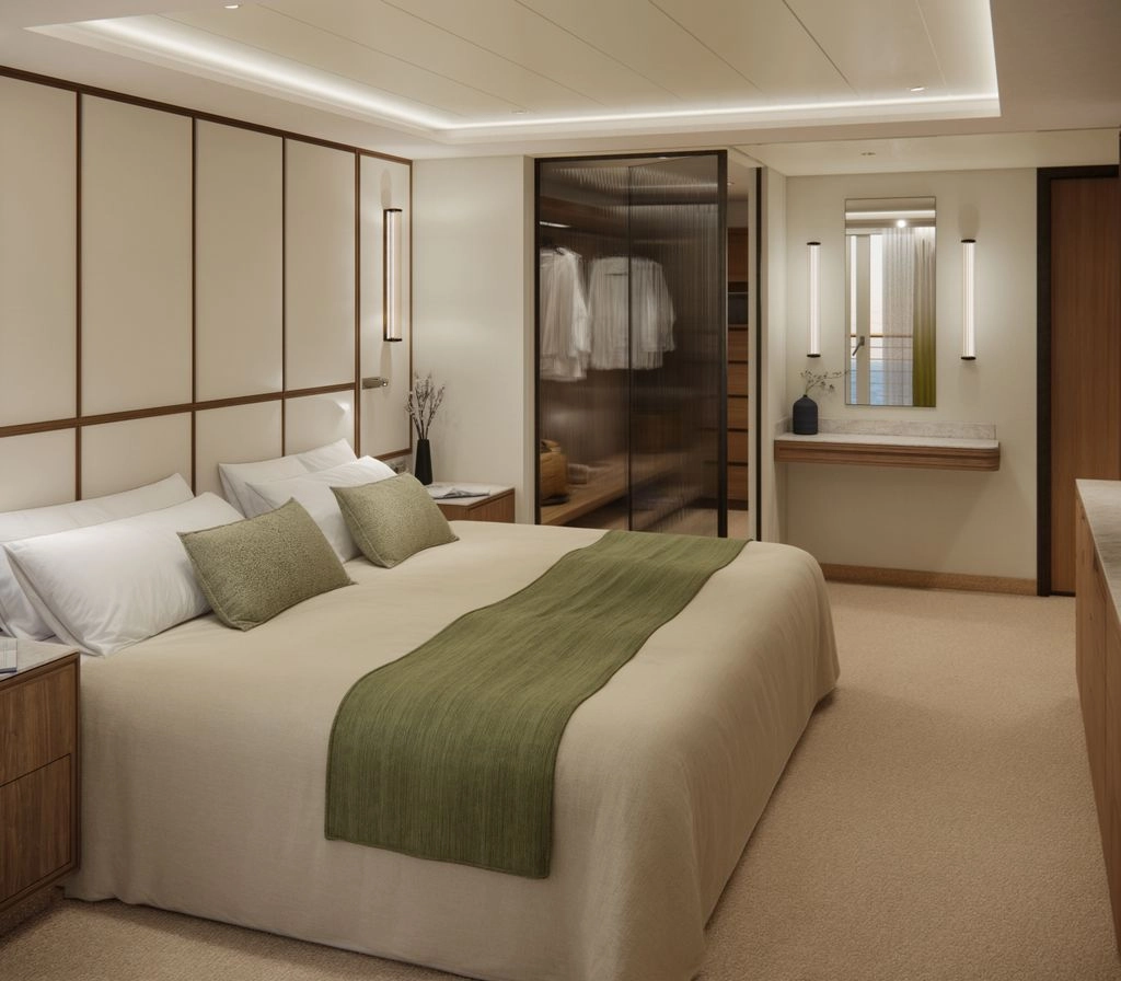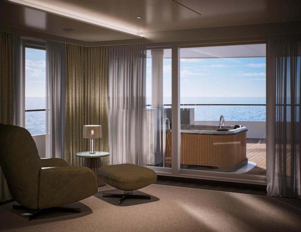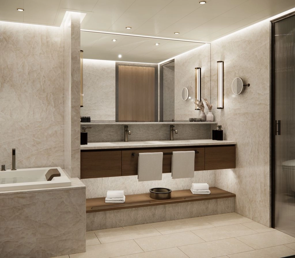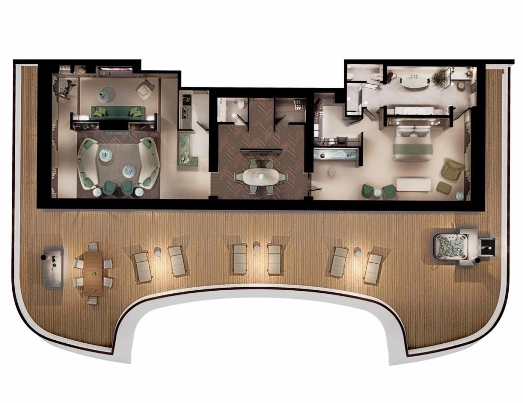 This one-of-a-kind suite is a first for Crystal – an expansive, residence-style sanctuary occupying a premium position at the aft of the ship, offering 270-degree views. Every detail has been carefully crafted to create a space that feels indulgent, refined, and supremely comfortable. The finest craftsmanship and premium materials, including custom wool carpets, walnut floors, marble, and bespoke cabinetry, are evident throughout, while the latest technology has been cleverly integrated to provide a superior experience. A state-of-the-art entertainment system plays music across multiple zones, including on the veranda for seamless indoor-outdoor living. The vast outside space features a private hot tub, outdoor shower, and dining area, while a guest bathroom and butler pantry allow you to entertain in the privacy of your suite. It’s the ultimate home at sea.
