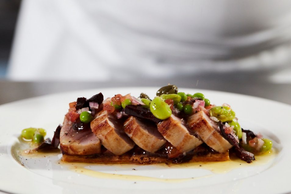 Tuna tataki, crispy tomato-olive tart, vegetables, vanilla white pepper