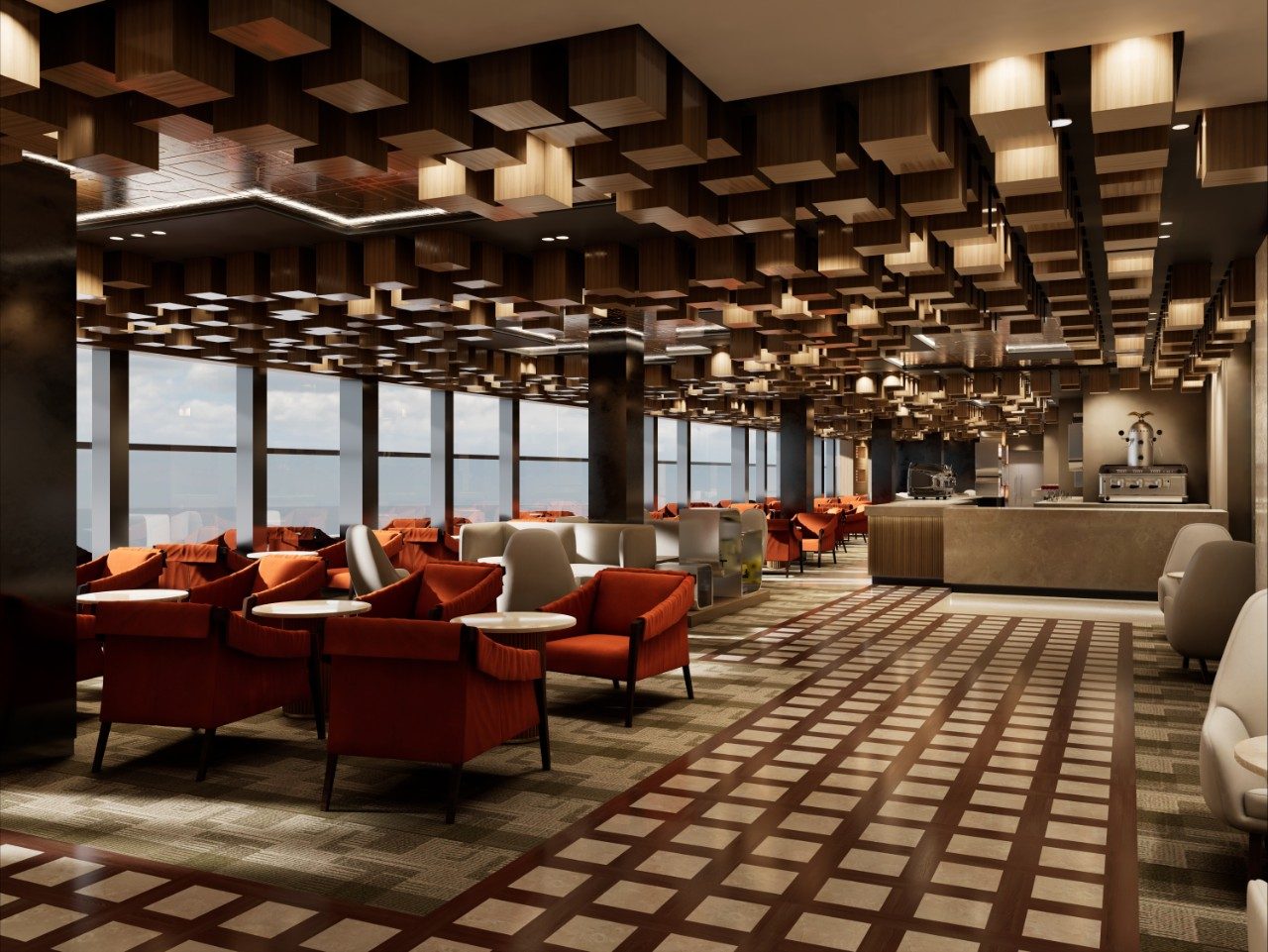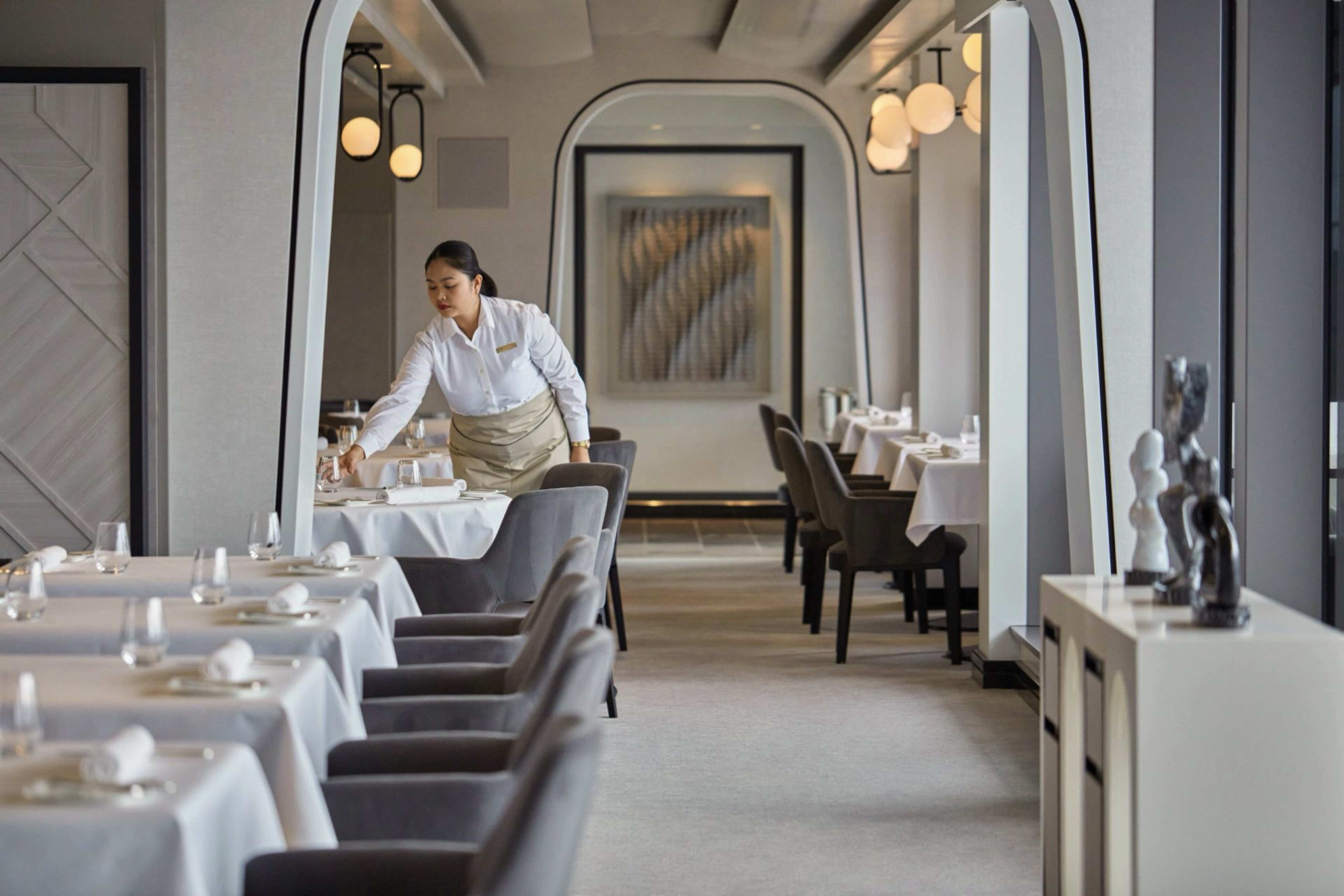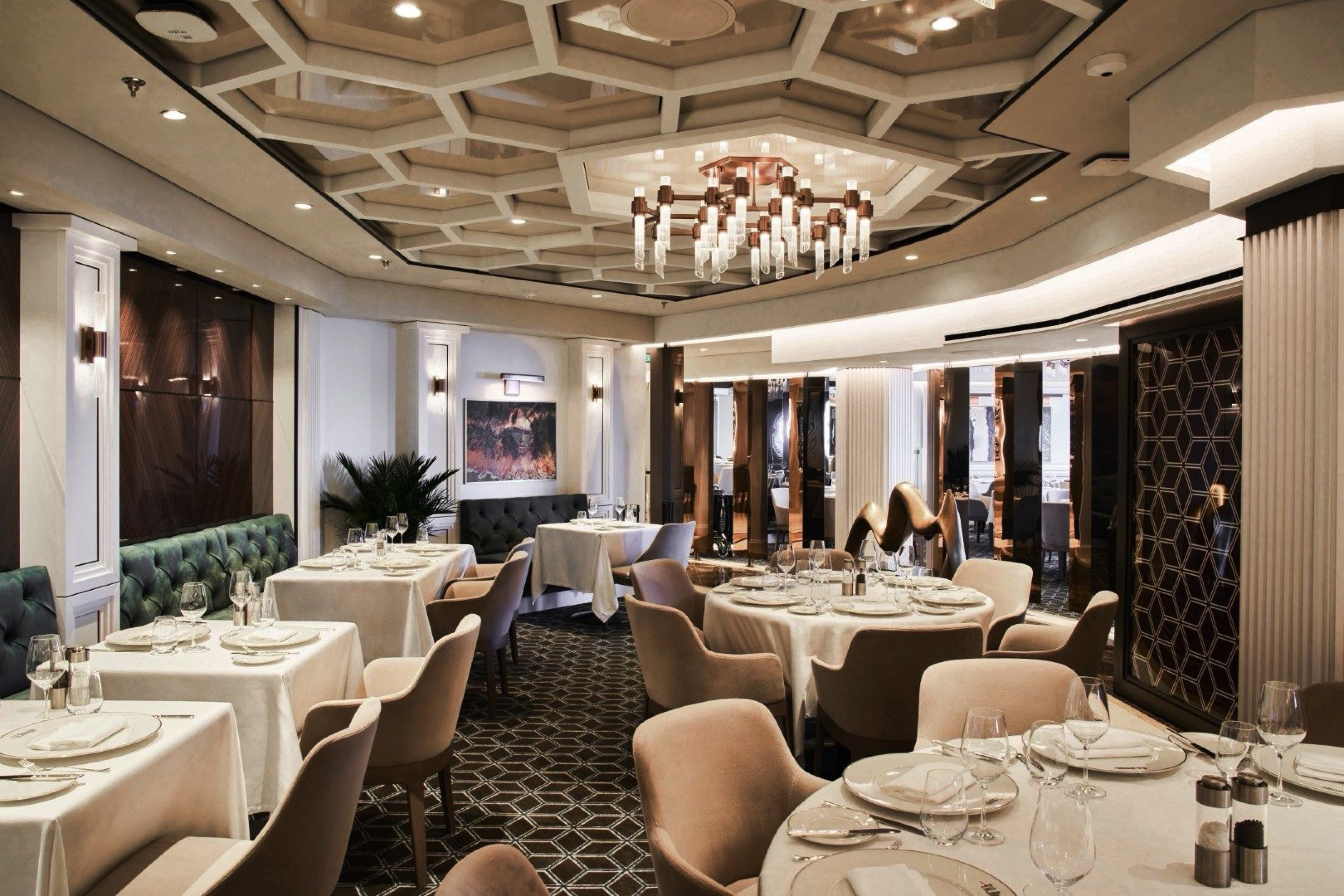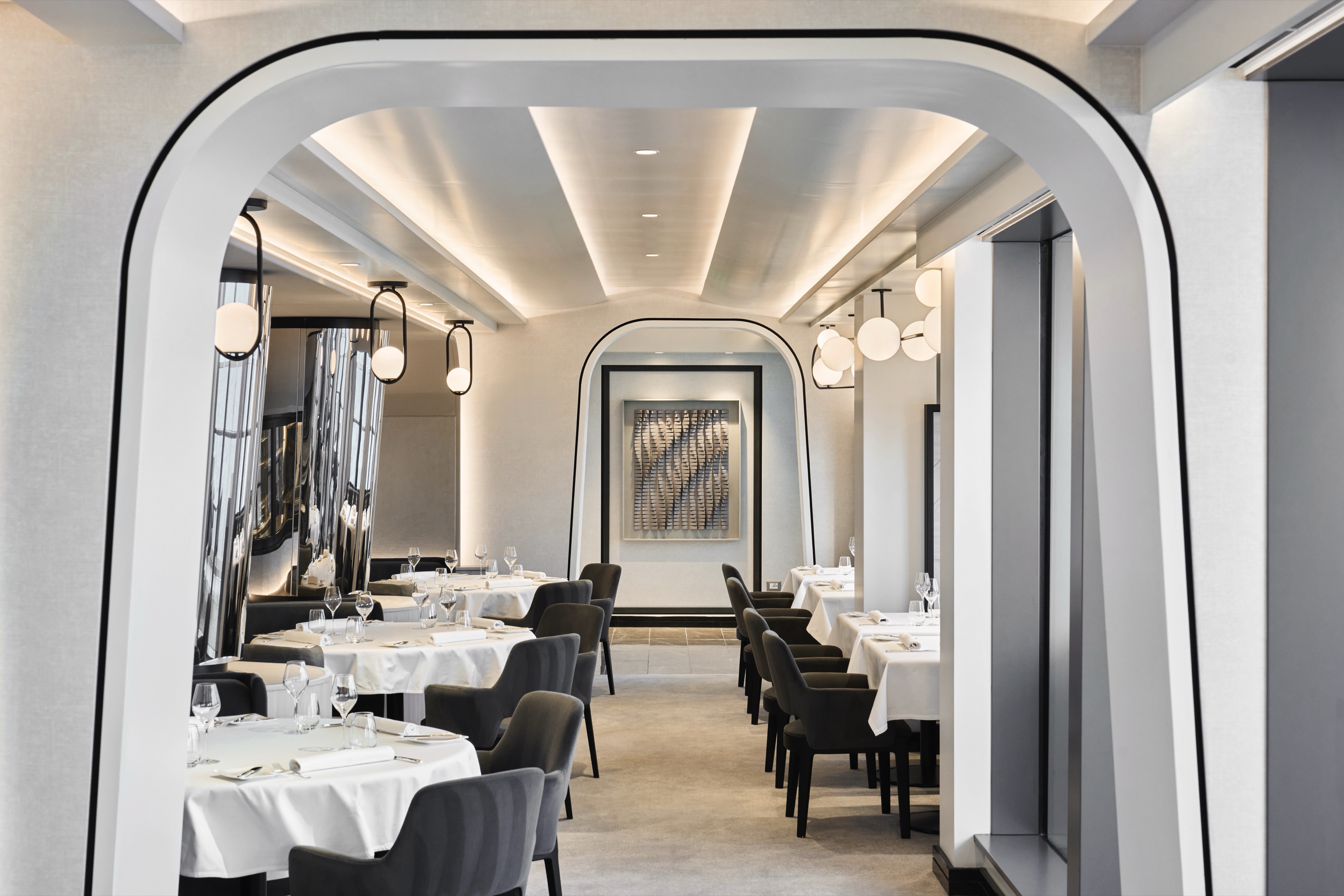 A universal, timeless dining experience, Fil Rouge is a visual articulation of the fundamentals of elegance. Intricate hexagons representing the simplest expression of perfection contrast with clean white walls adorned with inspiring works of art.