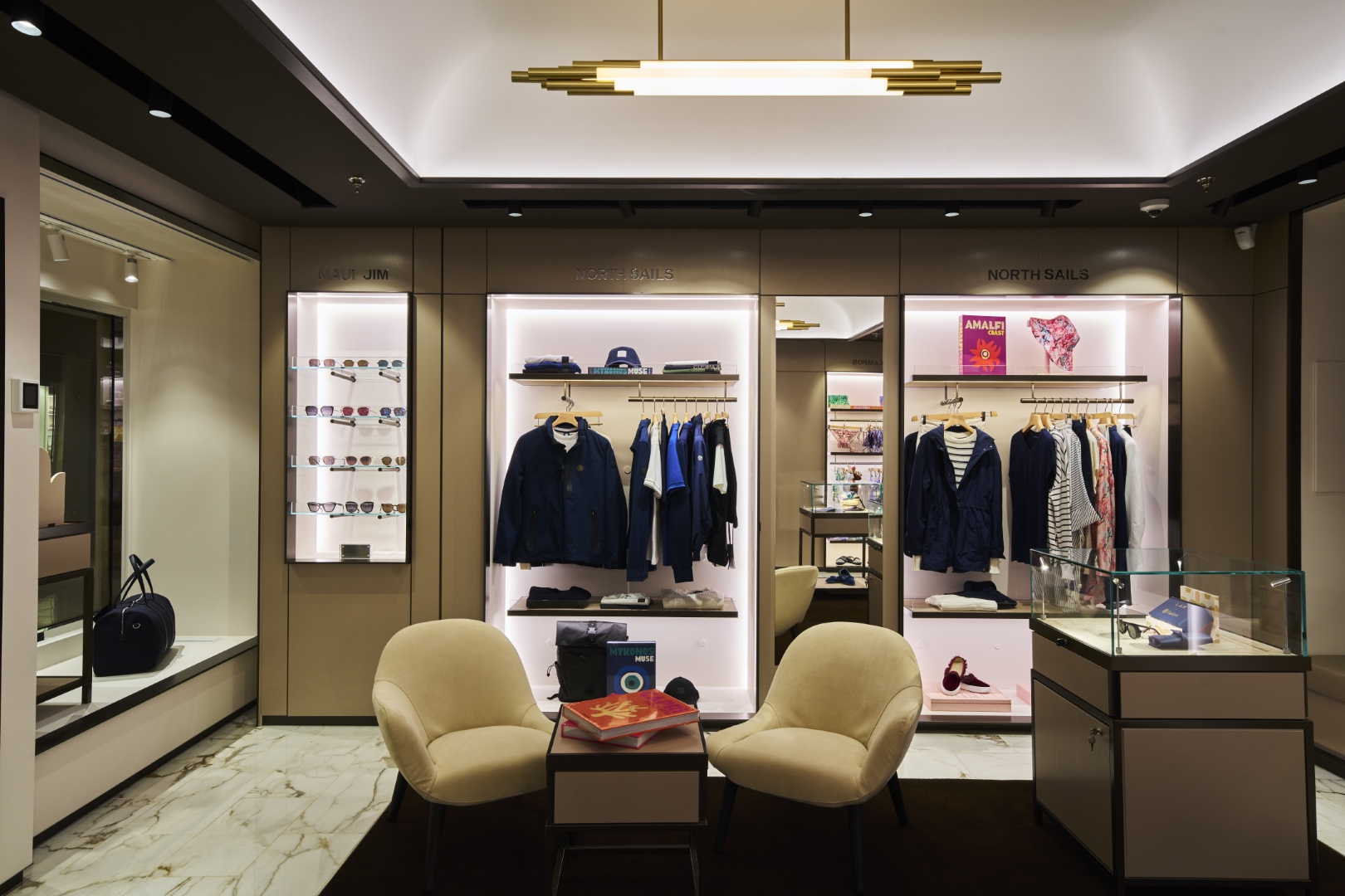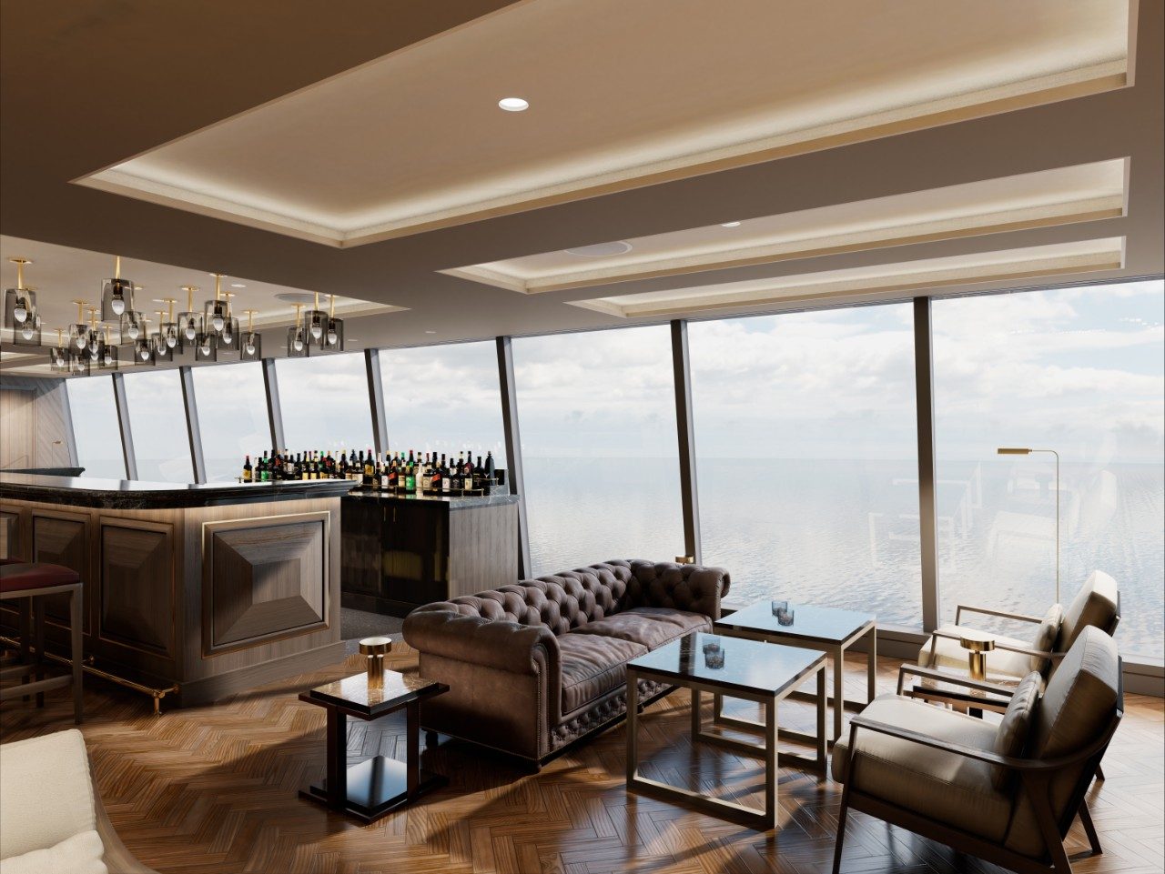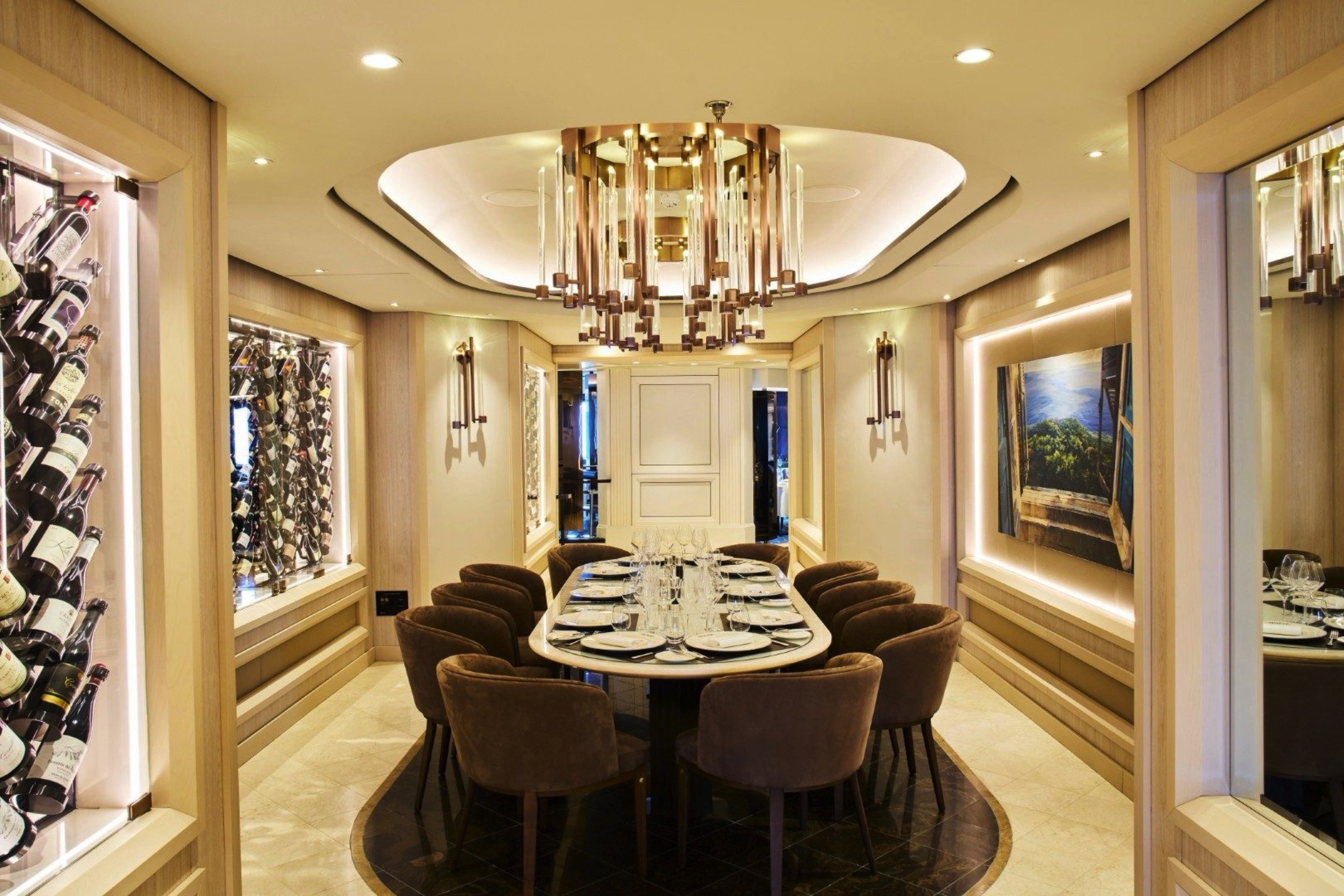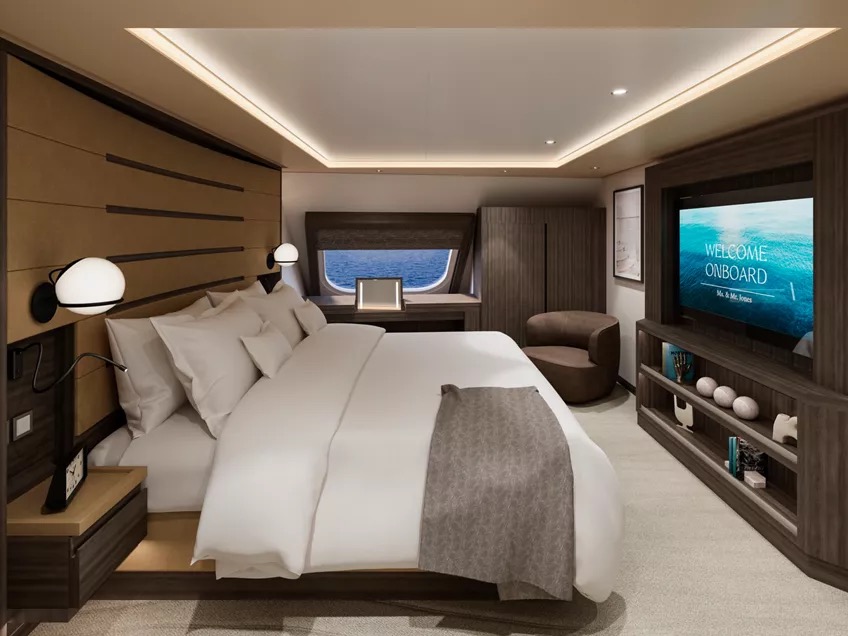For a true sense of being at home at sea, experience the effortlessly elegant spaces of the Retreat Residences include a stylishly decorated living area, a calm work space, a comfortable dining area for four, as well as a separate spacious bedroom with sea views and a spacious walk-in wardrobe with a seated vanity area. Sofas and chairs are by Molteni & C and the sophisticated lighting solutions are designed by Astep.