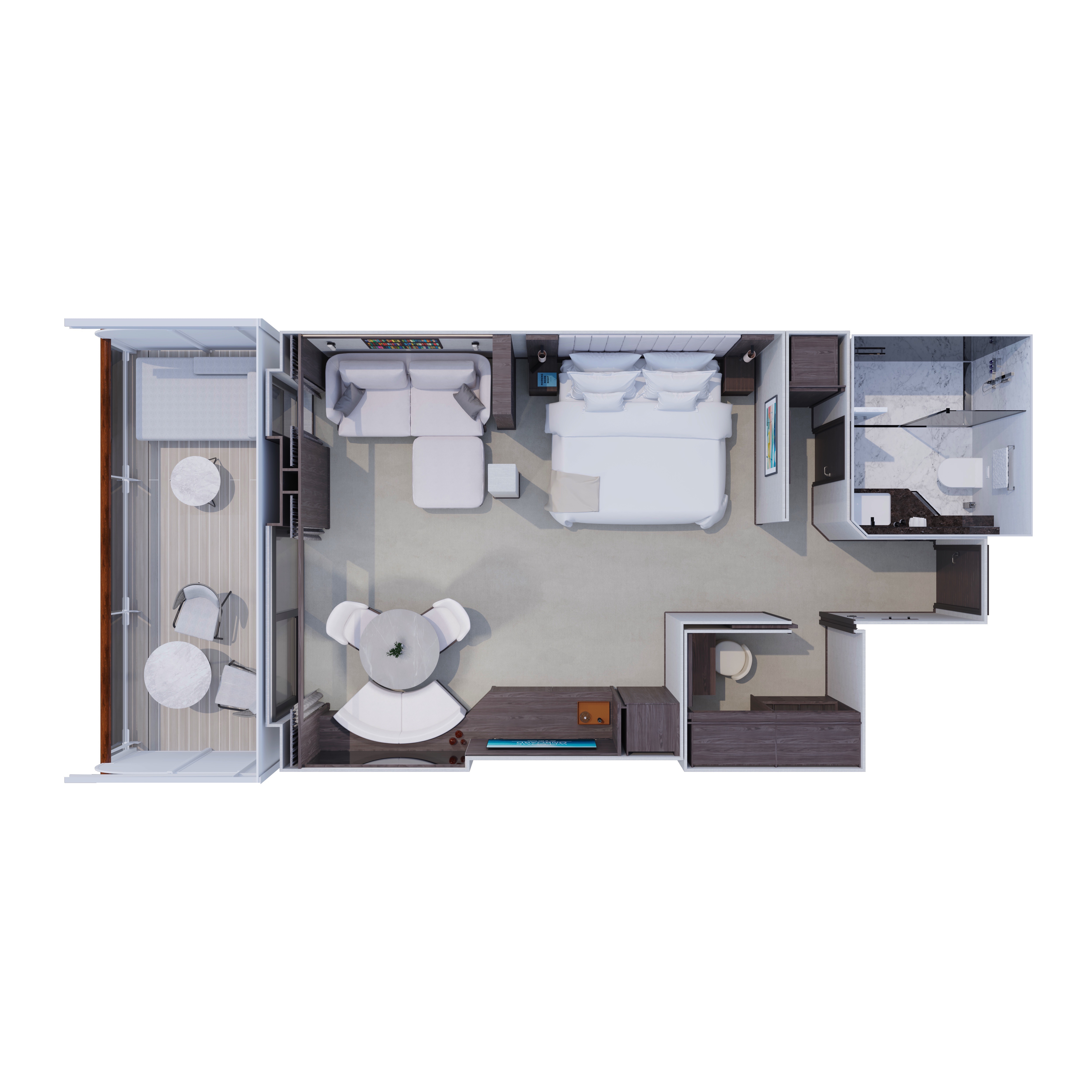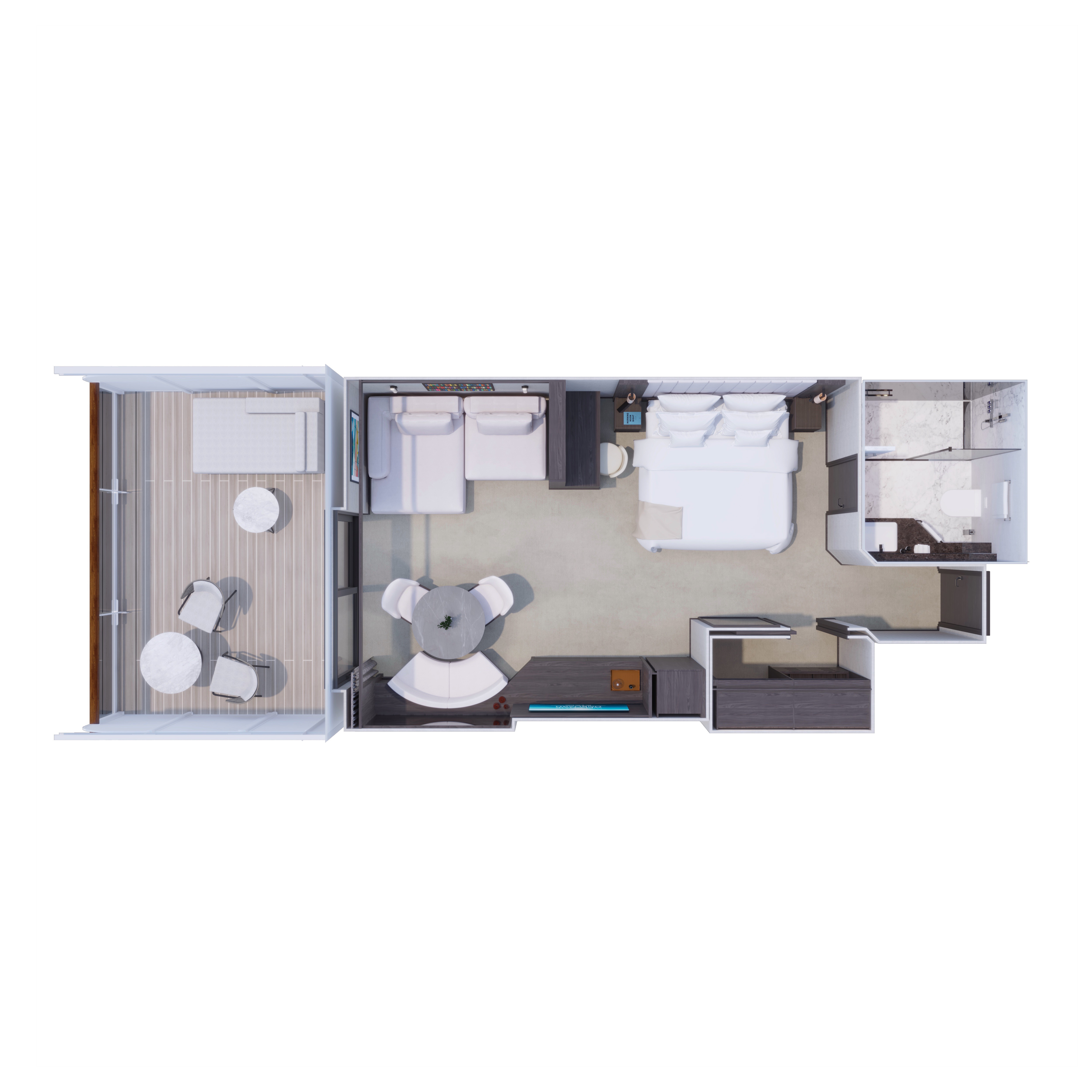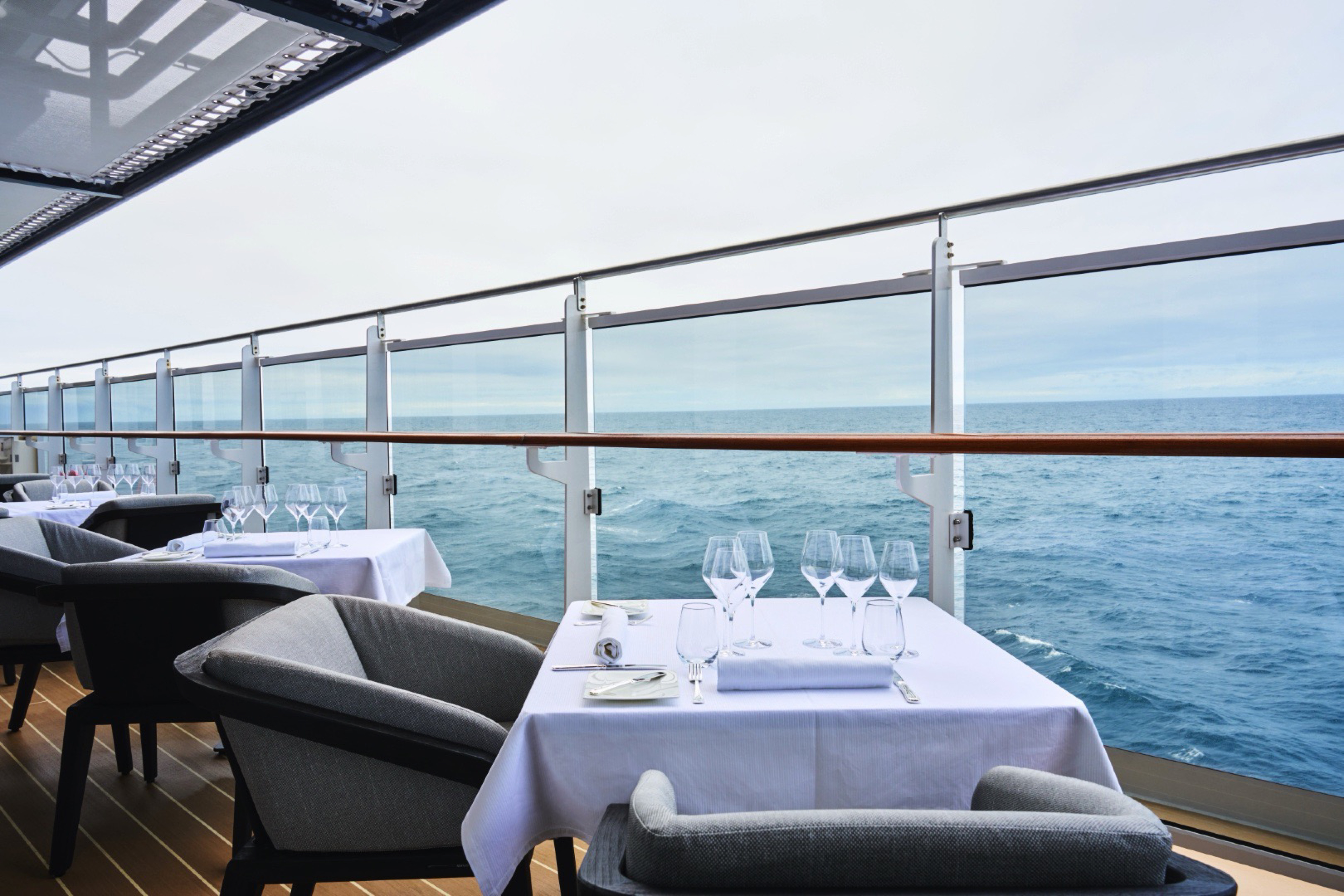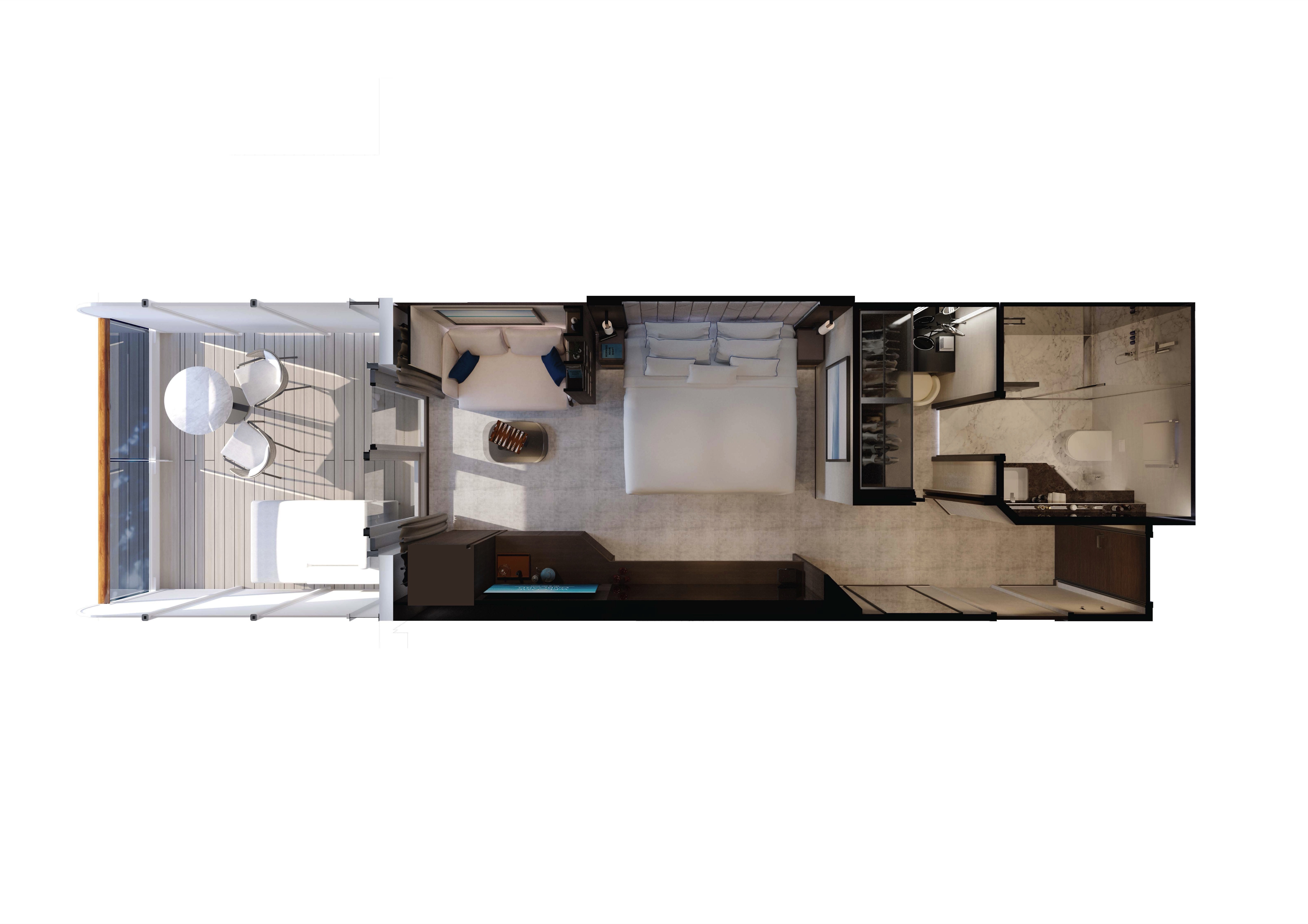 Our Ocean Terrace Suites are amongst the largest entry-level suites in the industry. Each one has floor-to-ceiling windows, and a private sun terrace featuring a dining table and a daybed, allowing guests to feel closer to the ocean as it carries them on their journey.
