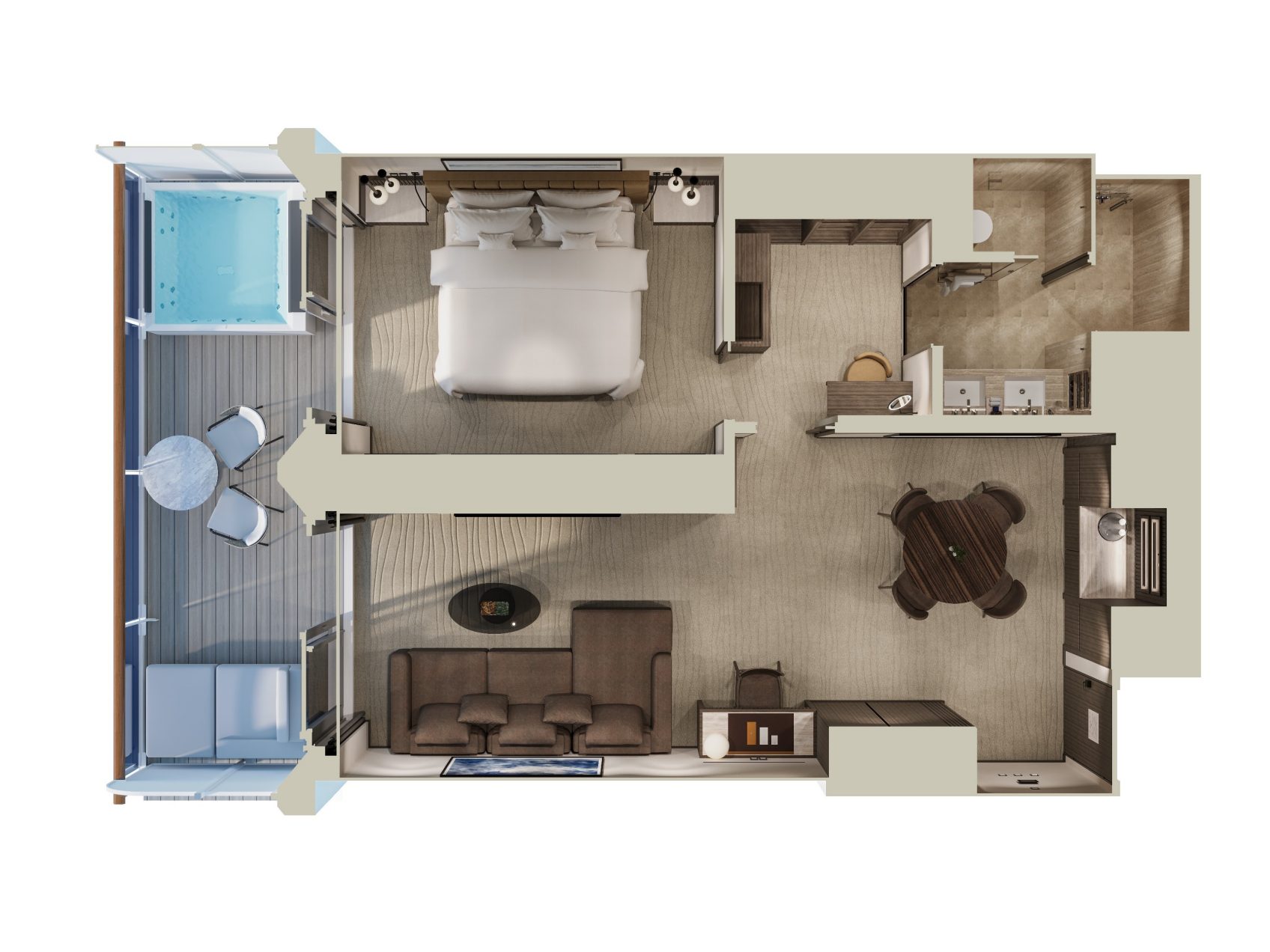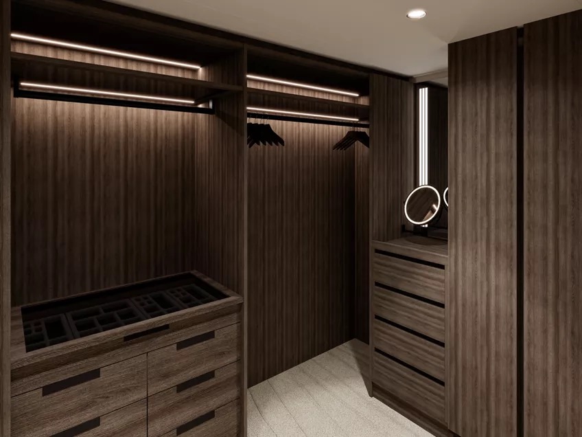 For a true sense of being at home at sea, experience the effortlessly elegant spaces of the Cove Residences featuring a stylishly decorated living area, a calm work space, a comfortable dining area for four, as well as a separate bedroom with sea views and a spacious walk-in wardrobe with a seated vanity area. Sofas and chairs are by Molteni & C and the sophisticated lighting solutions are designed by Astep. The private sun terrace allows guests to unwind and savour the ocean featuring a private outdoor whirlpool, a dining table and sun loungers.