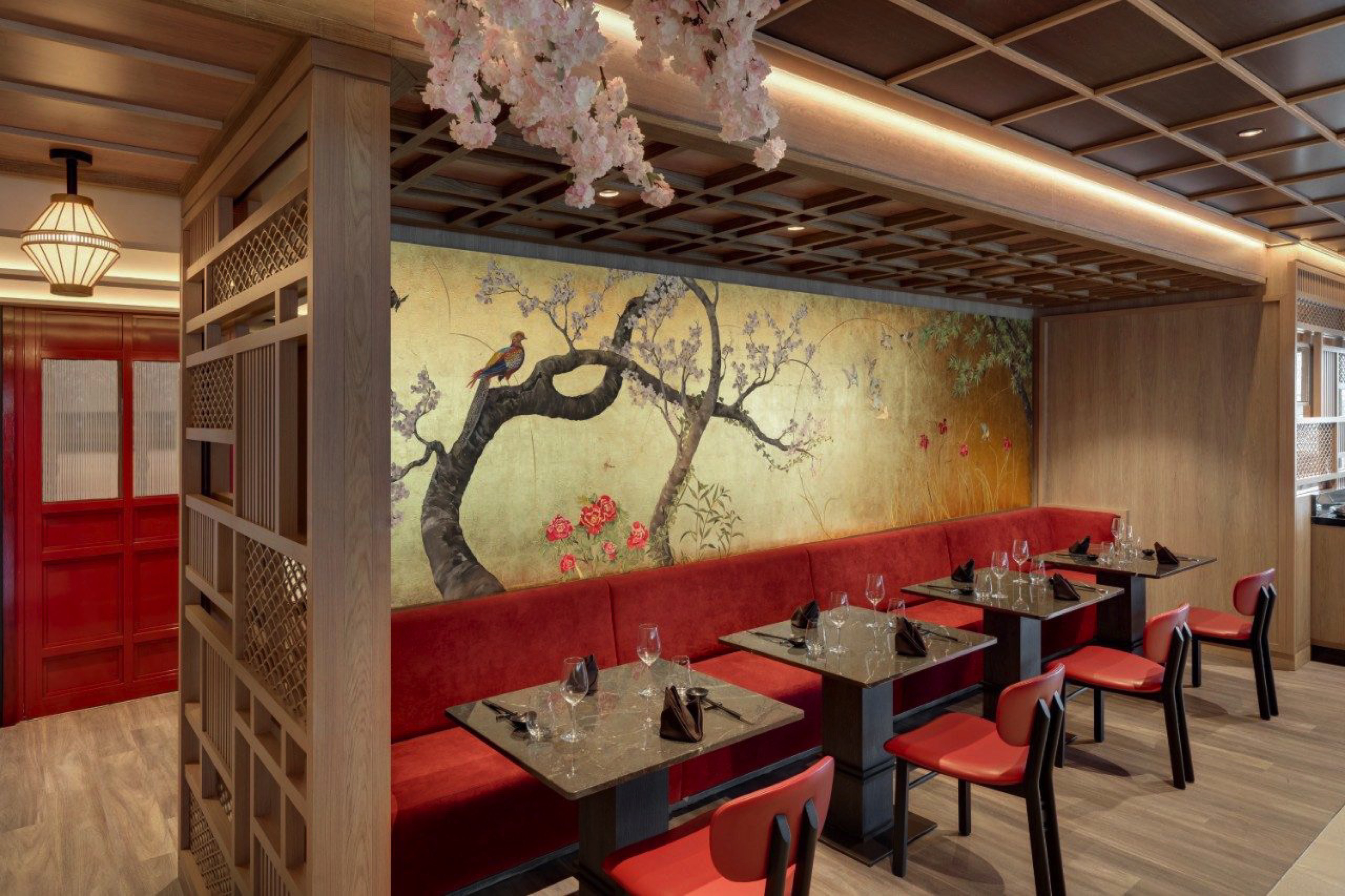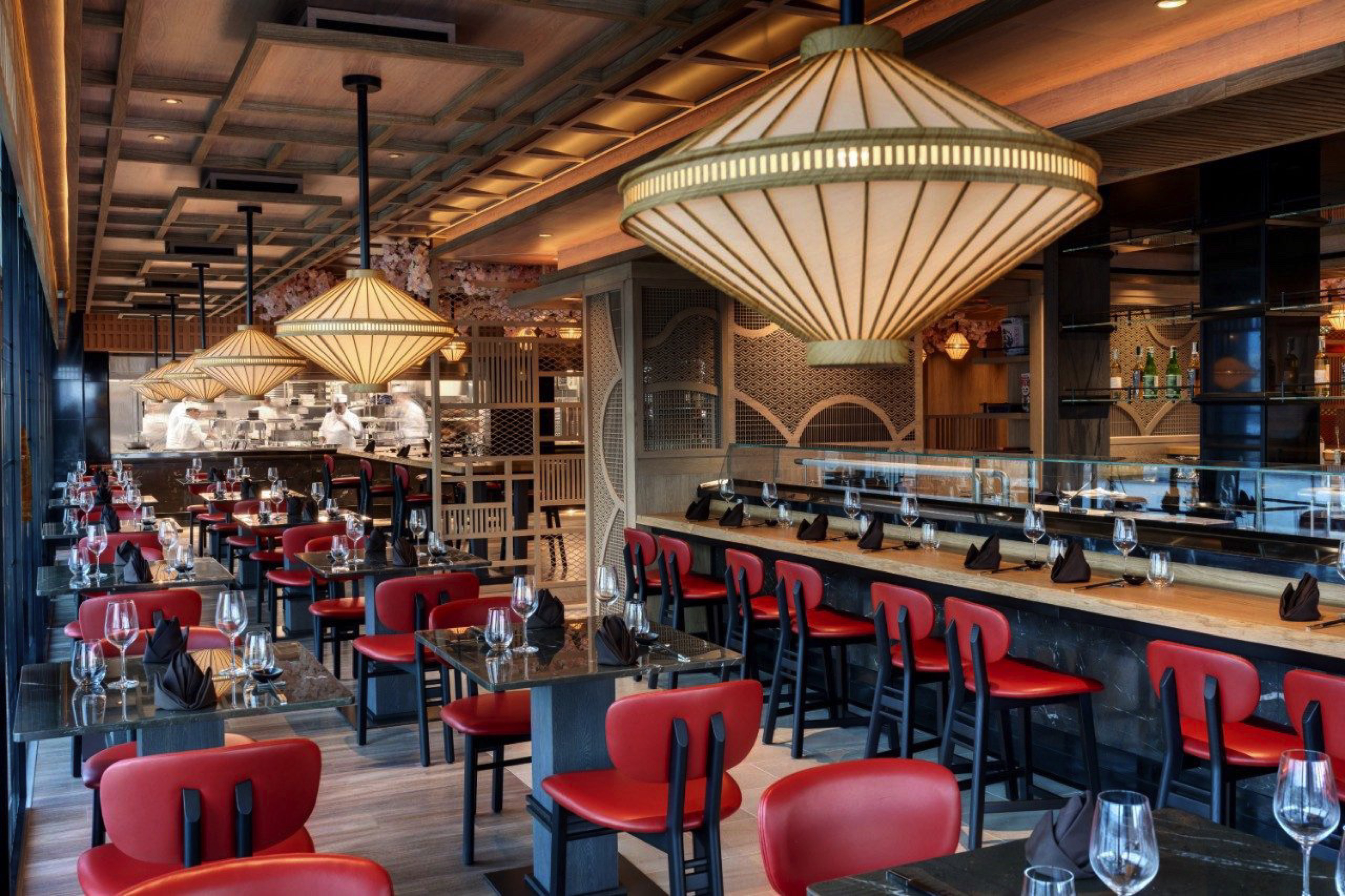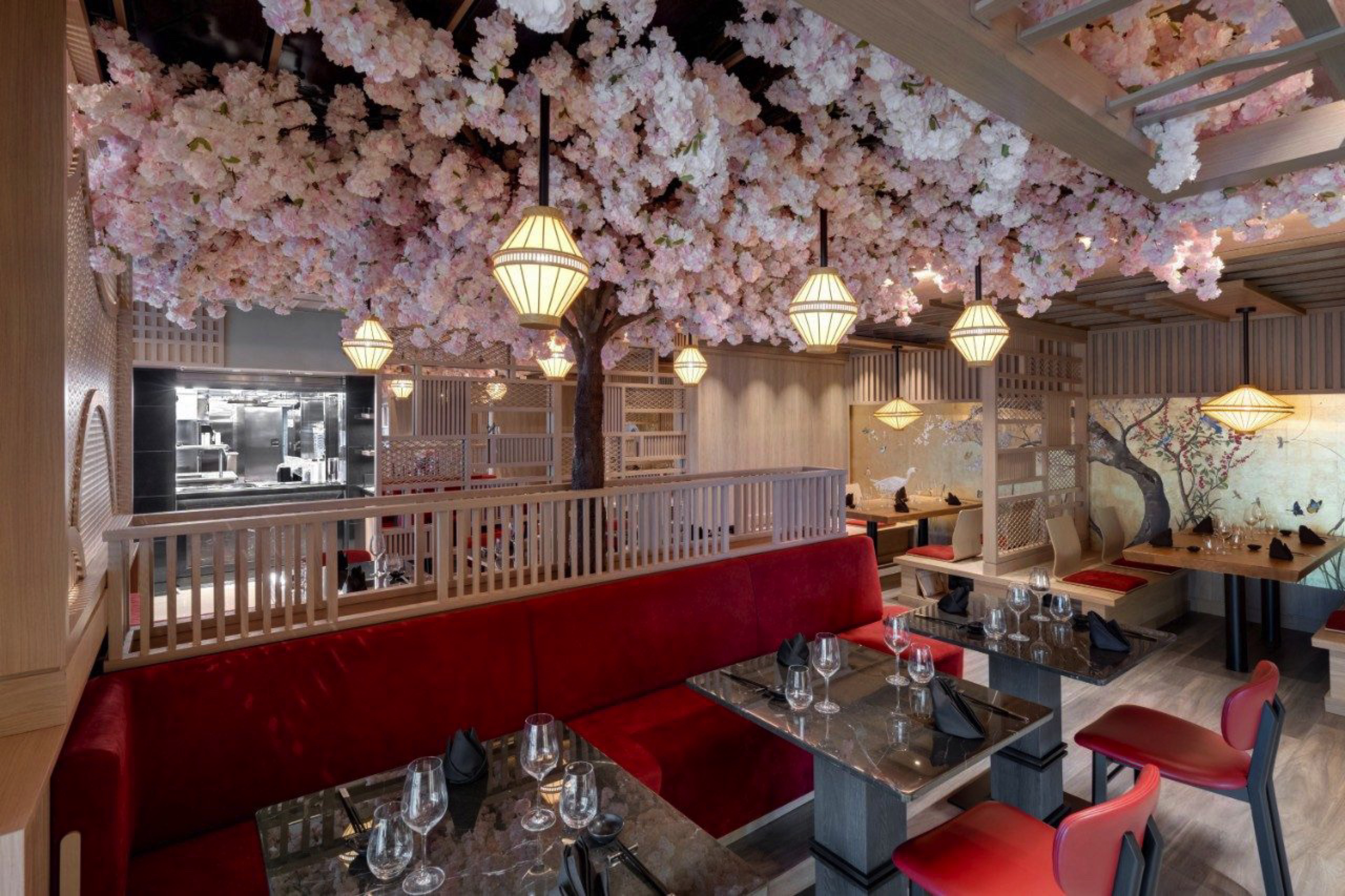 The space takes inspiration from Japan’s rich cultural heritage blended with distinct Japanese design cues, to create an intimate and welcoming environment. The ancient tea rooms of Kyoto provide the inspiration for Sakura’s aesthetic, where dark wood frames lead your eye to the ceiling, adorned with a blossom tree canopy which envelops diners in a warm atmosphere of festoon lights.