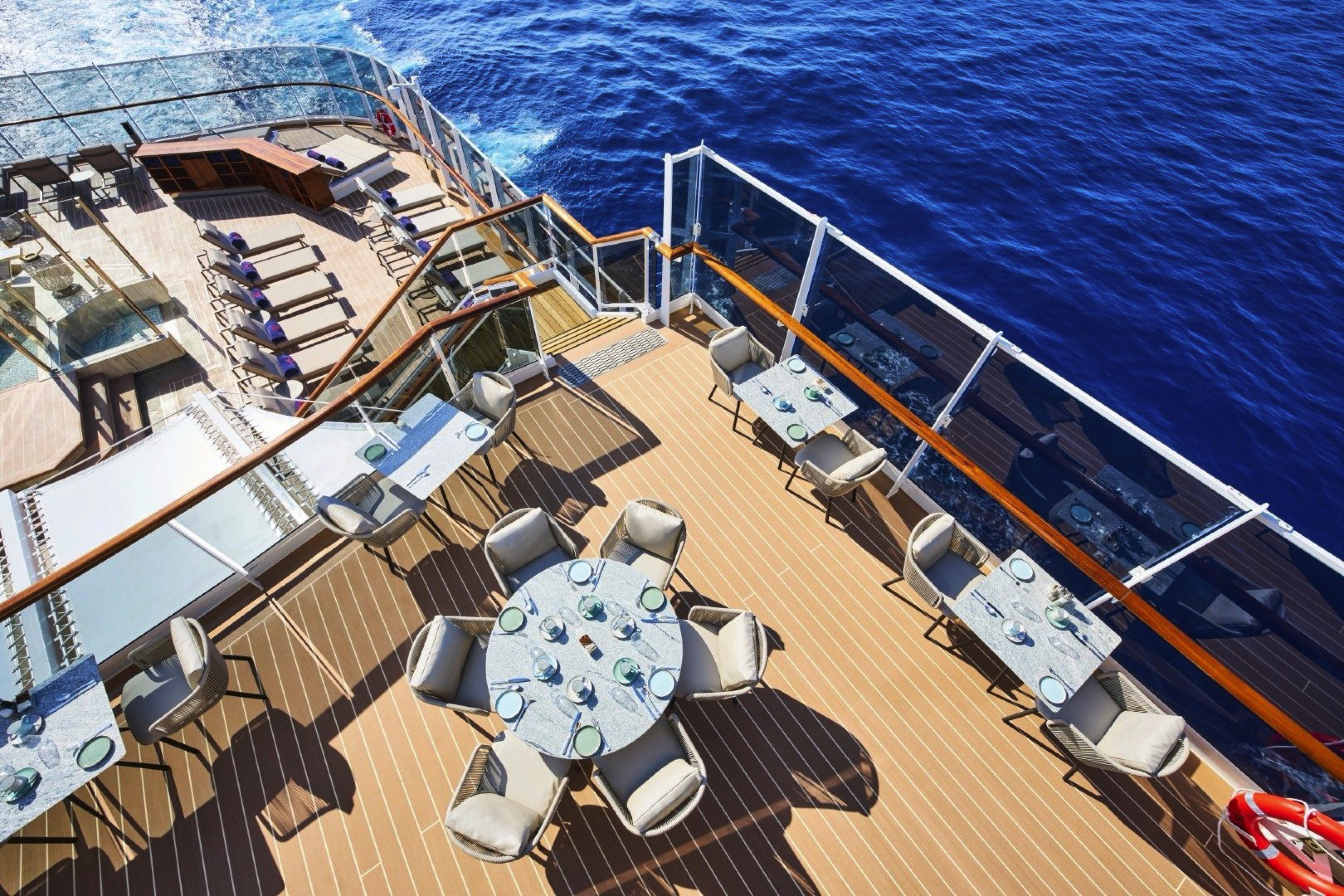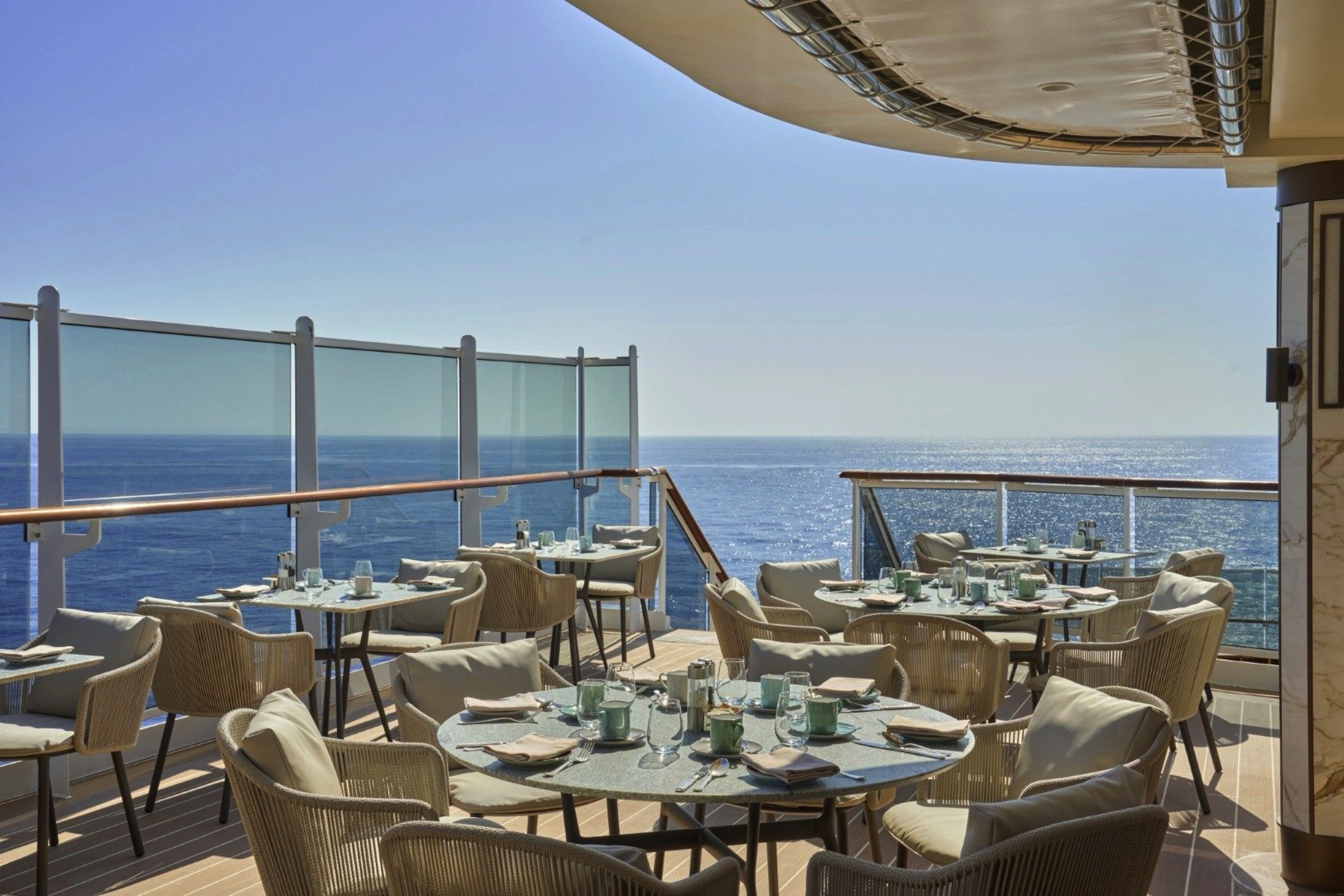 Our Ocean Grand Terrace Suites are situated on decks 6 and 7, offering a more spacious private sun terrace featuring a dining table and a daybed, allowing guests to savour the ocean from the comfort of their daybed.
