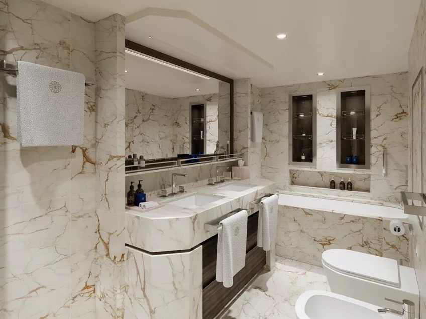 The Owner’s Residence features an expansive stylishly decorated living area, a comfortable dining area for eight guests, a separate spacious bedroom with sea views, including a comfortable working space, an en-suite luxurious marble bathroom sculpted of precious Calacatta marble, with a bathtub a separate shower, a private steam room, and a walk-in wardrobe. The suite also features an additional guest powder room.