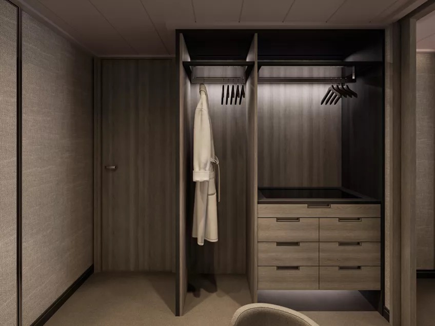 For a true sense of being at home at sea, experience the effortlessly elegant spaces of the Cove Residences featuring a stylishly decorated living area, a calm work space, a comfortable dining area for four, as well as a separate bedroom with sea views and a spacious walk-in wardrobe with a seated vanity area. Sofas and chairs are by Molteni & C and the sophisticated lighting solutions are designed by Astep. The private sun terrace allows guests to unwind and savour the ocean featuring a dining table and sun loungers.