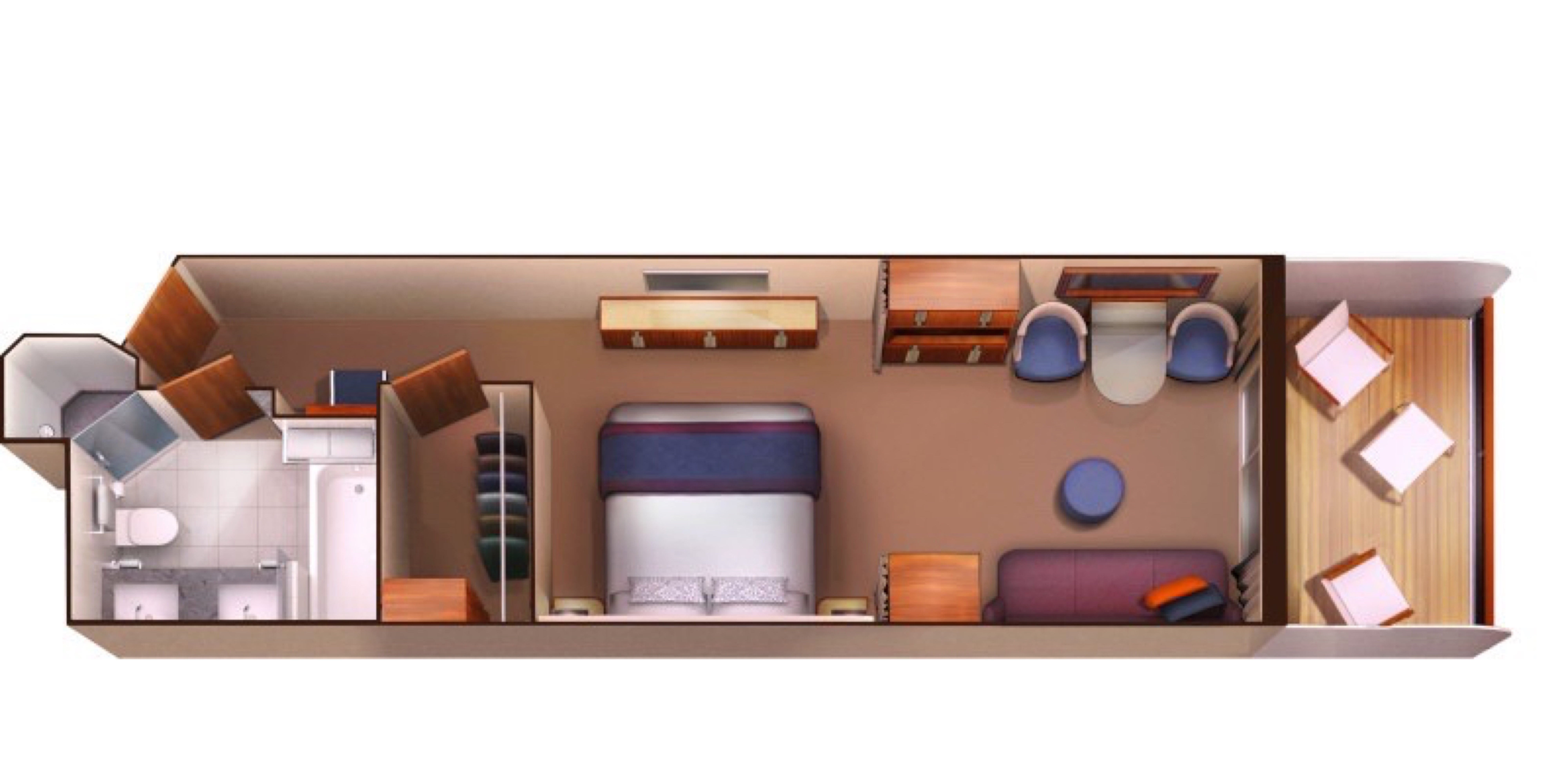 Located on Deck 8; mid-ship suites 846 and 849 inside space of 989 square feet (92 square meters) plus one veranda of 197 square feet (18 square meters)