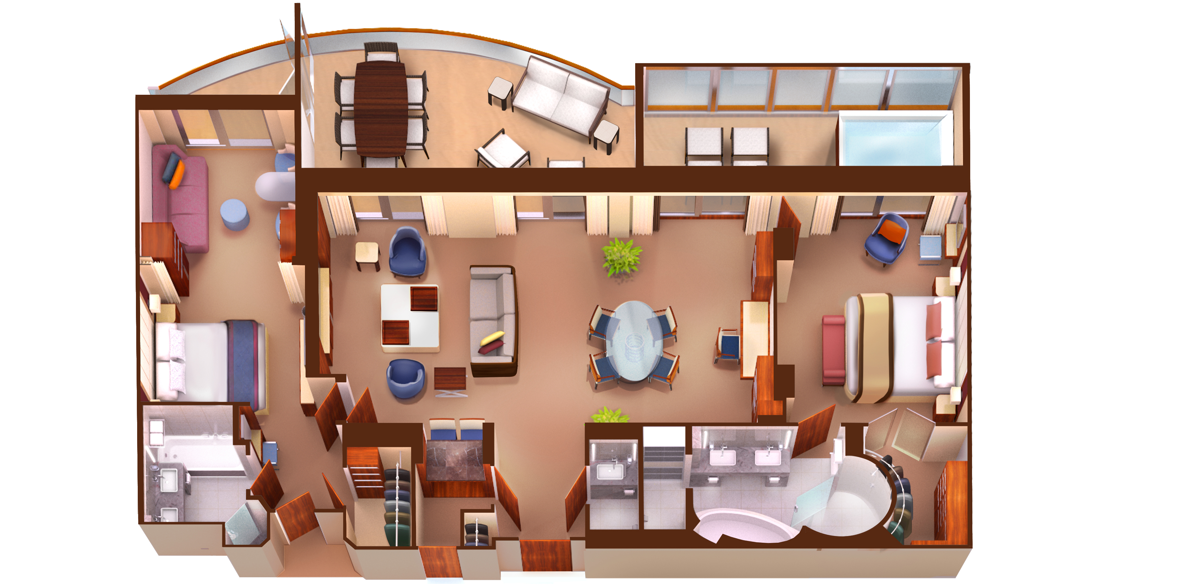 Located on Deck 8; Combine mid-ship suites 849 and 851 for suite 8491 or suites 846 and 848 for suite 8468 for a total inside space of 1,292 square feet (120 square meters) plus two verandas totalling 244 square feet (23 square meters)