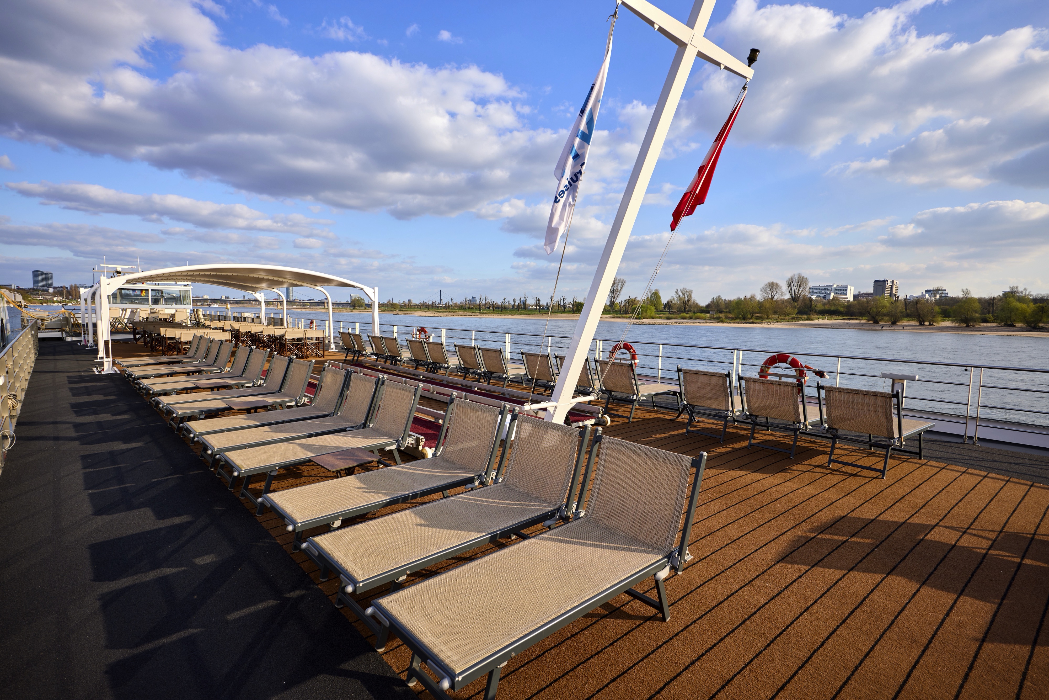 Enjoy the beautiful view from the sun deck while enjoying a drink on a deck chair.