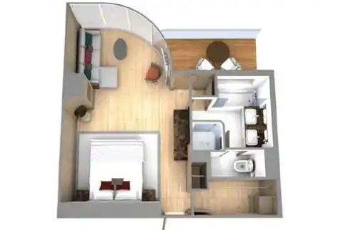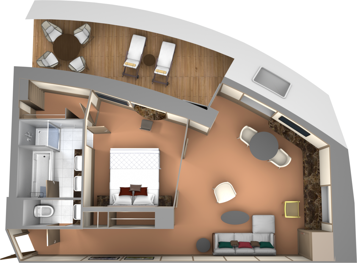 Entry with large closet to store gear and personal belongings. Comfortable living area with high-definition TV, writing desk and dining table for two for meals in-suite. Glass door leading to a curved veranda with sun loungers and a table for four. Separate bedroom with queen-sized bed has its own high-definition TV, a large window, makeup vanity and walk-in closet. Five-piece bathroom designed with multiple doors that can create a half-bath, and also features a separate shower and bathtub.