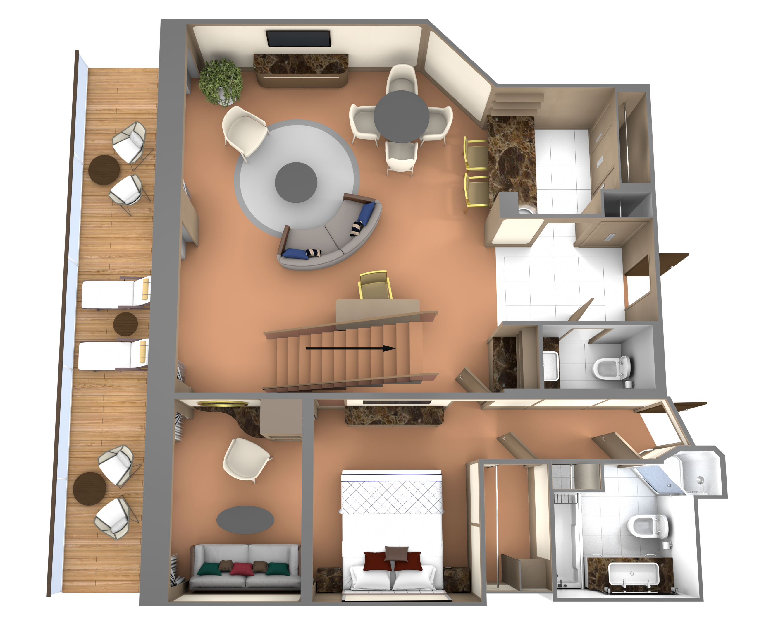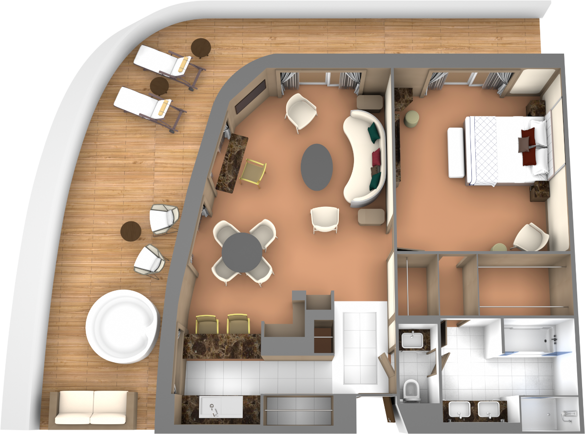 Foyer entry to living area with high-definition TV, dining table for four, guest bath, pantry with wet bar and large windows. Separate bedroom with queen-sized bed, makeup vanity, generous closet space and a glass door leading to a large curved 595 square foot veranda that includes its own canopied whirlpool spa tub, sun loungers, sofa and chairs. A five-piece bathroom with a separate shower and tub.