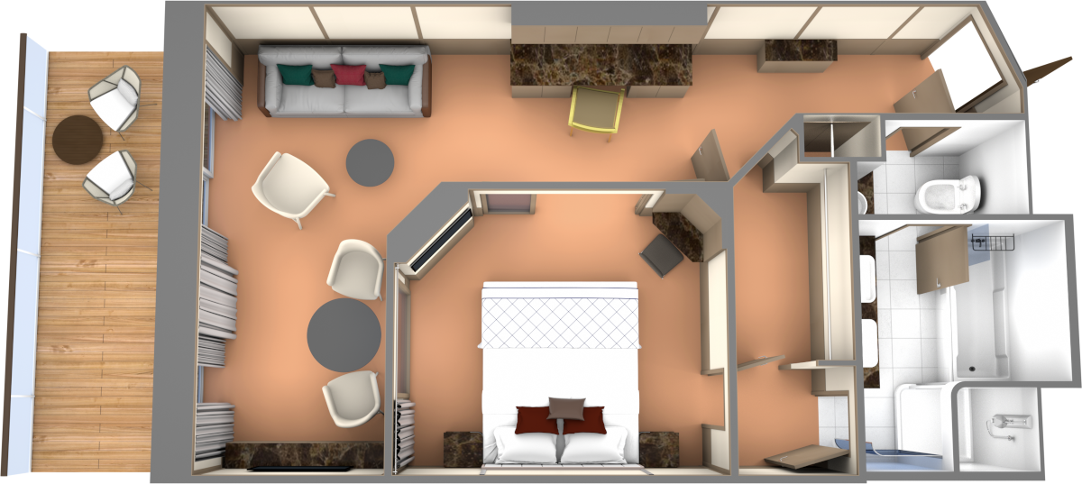 Suites 513-516, 611-614, 711-714, 802-805; Total space: 417 sq. ft. (39 sq. m.) incl. veranda of 85 sq. ft. (8 sq. m.) All Panorama Veranda Suites feature a comfortable living area; private veranda; queen-size bed or two twin beds; walk-in closet; personal safe; interactive TV with music and movies; fully stocked bar and refrigerator; writing desk with personalized stationery; makeup vanity; spacious bathroom, separate tub and shower, plush robes, slippers, luxury health and beauty products, hairdryer and 110/220V AC outlets. *Some veranda sizes vary.