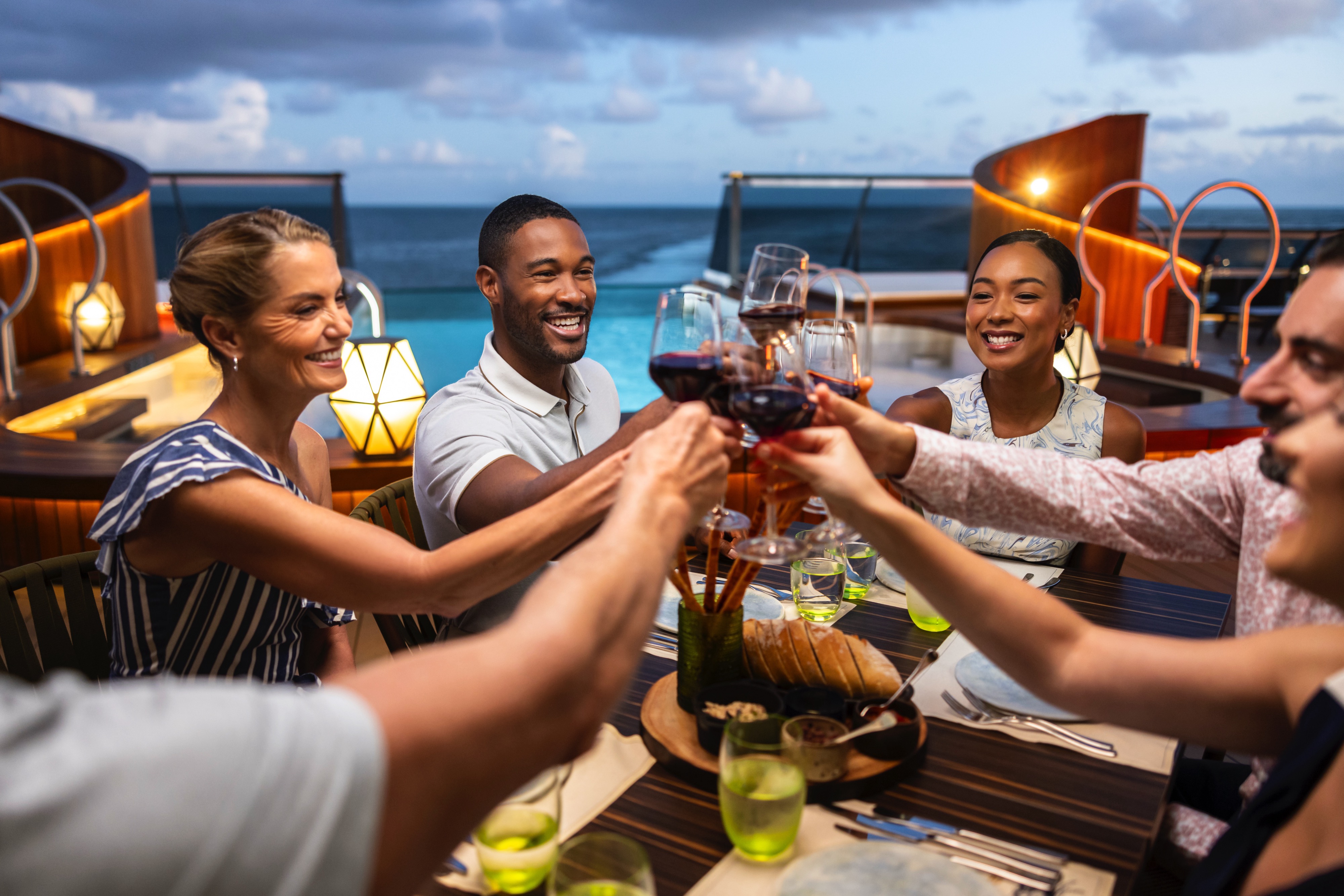 Each evening, our skilled Earth & Ocean chefs create an imaginative array of fresh, inventive dishes—a sophisticated menu celebrating eclectic traditional flavors from around the world, served in a relaxed setting under the stars for a distinctive dining experience unlike any other on board.