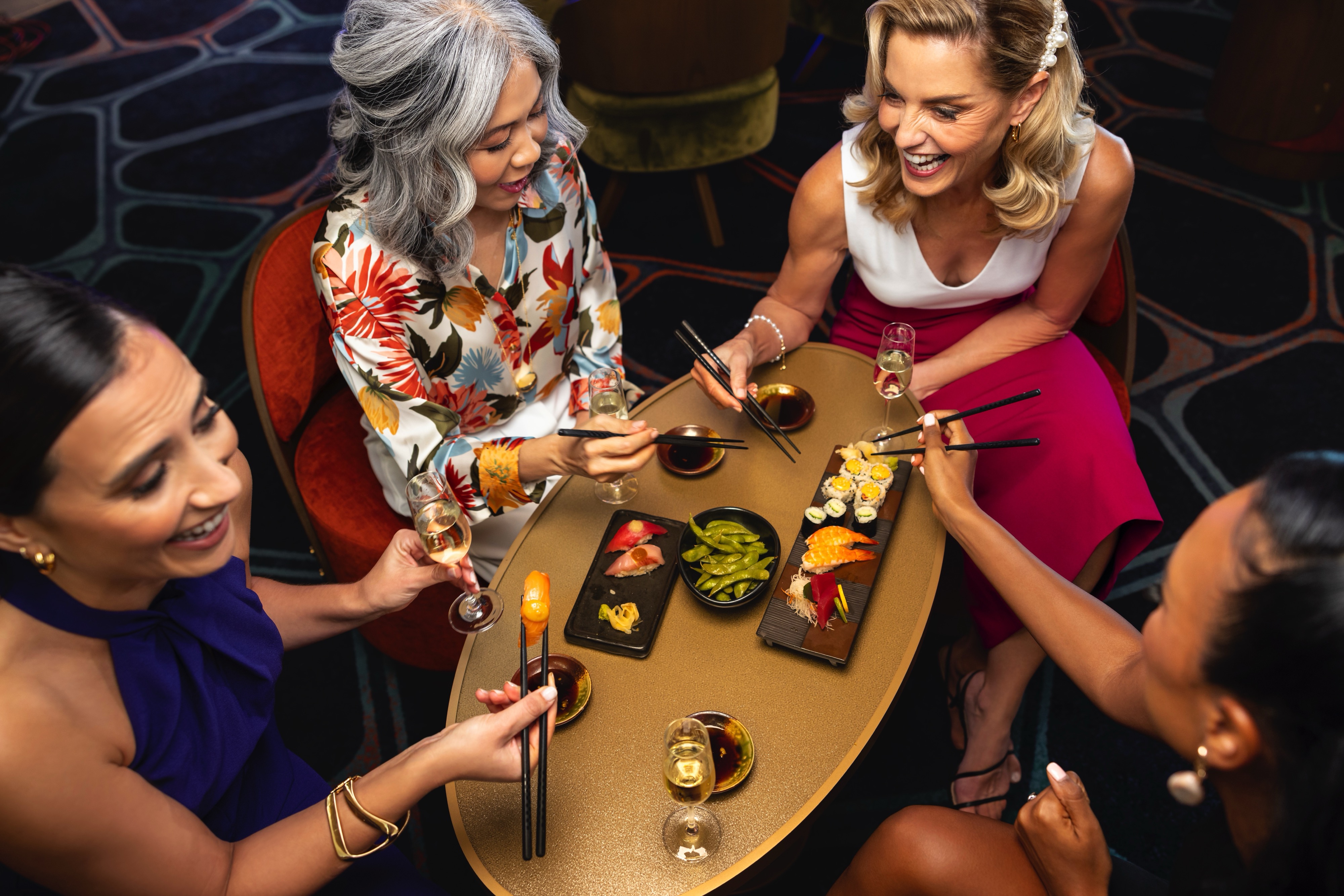 Seabourn Sojourn, Seabourn Quest, Seabourn Venture, and Seabourn Pursuit offer Sushi in The Club, serving a variety of light sushi bites freshly made to order each evening.
