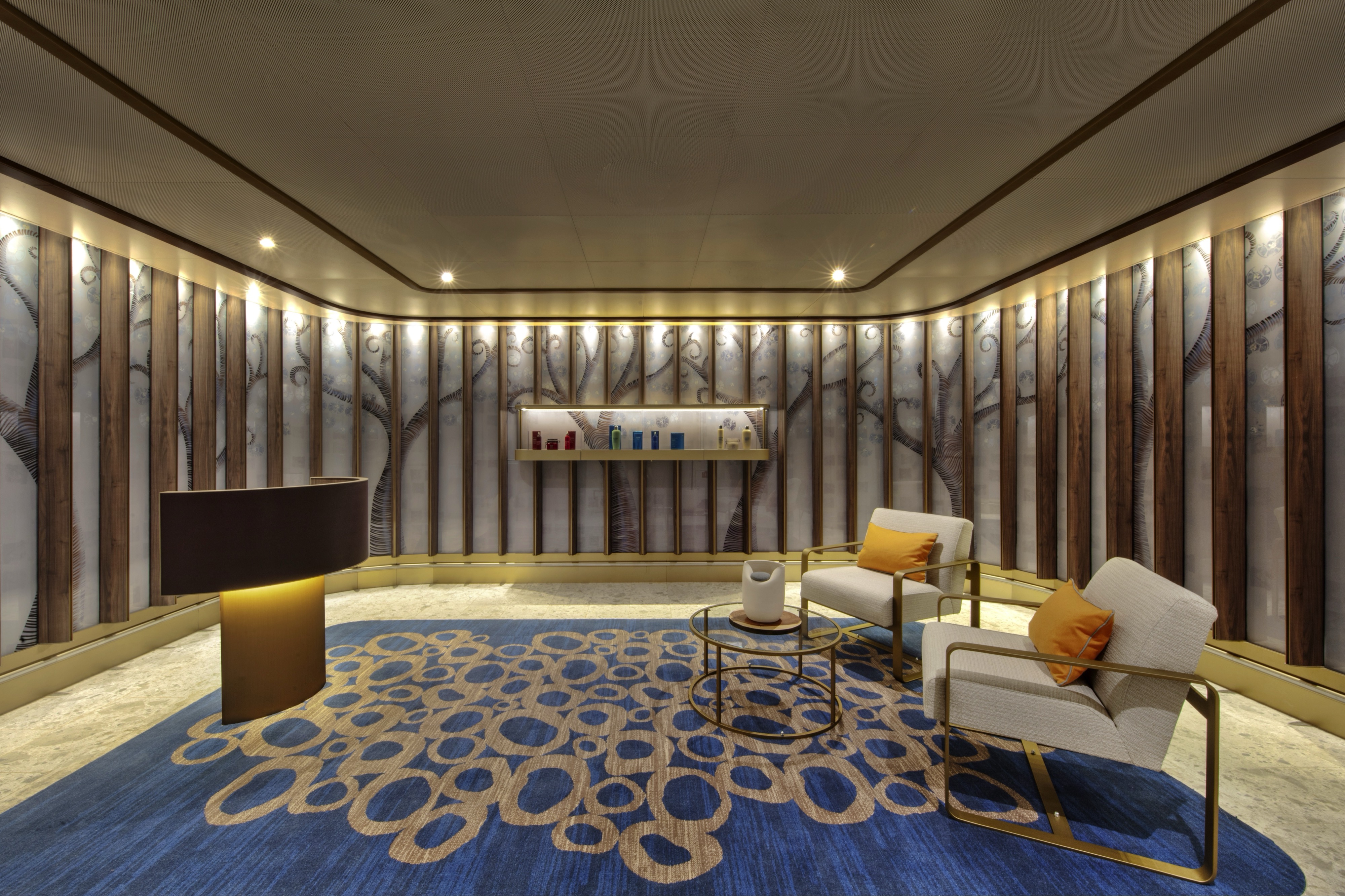 Custom furniture designed in a variety of warm, natural materials creates an inviting, tactile atmosphere. An ode to the adventurous, the Expedition Lounge features an etched glass partition displaying a vintage map of Antarctica and vitrines showcasing intricate tools and devices of the trade. Two large touchscreens will also display a wealth of information including photos, navigational charts, weather charts, and maps.