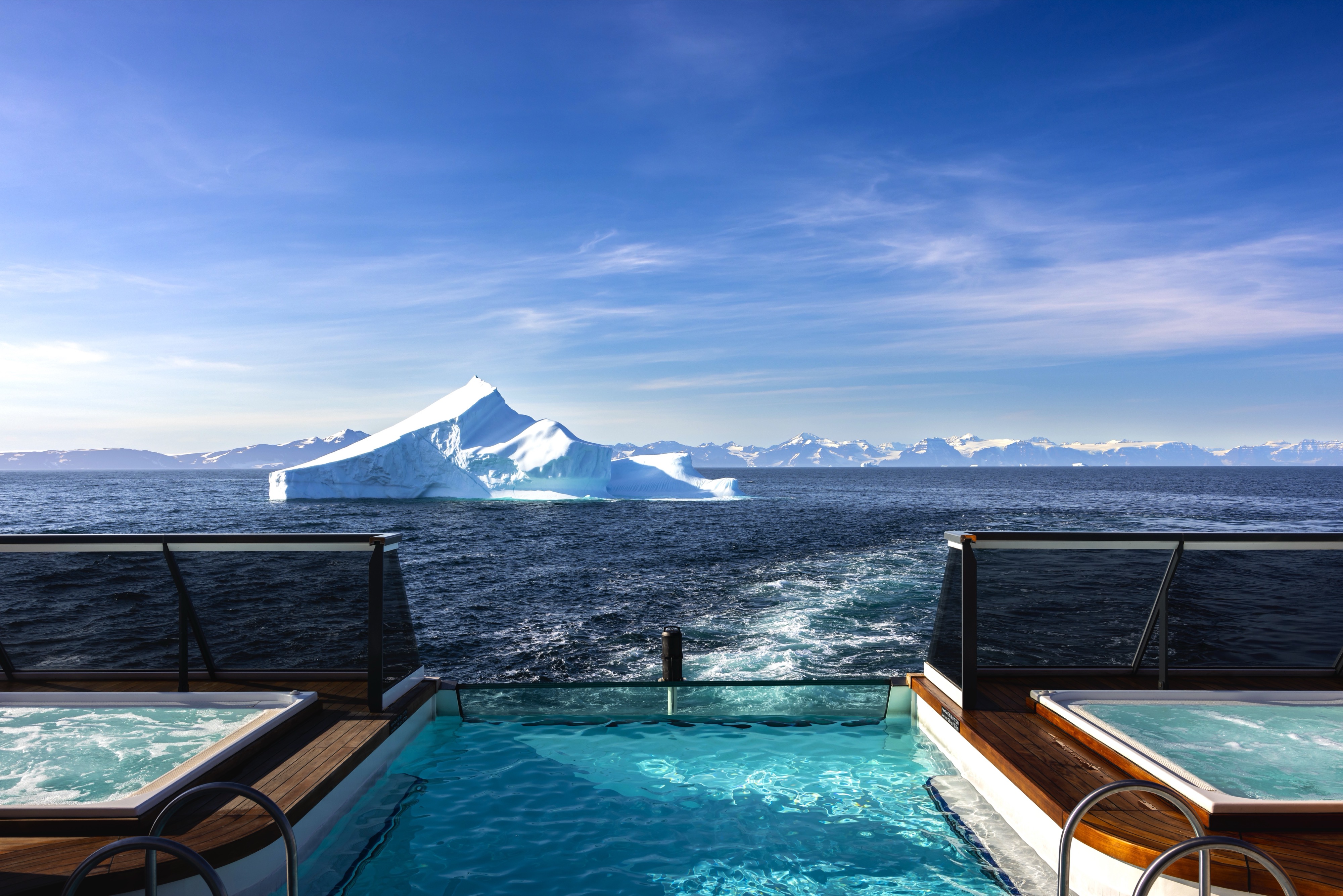 The space provides direct access to the Bow Sprit on Deck 6 forward (when conditions permit) to give guests the sensation of standing in front of the ship and views of waves parting and ice sloughing off the bow at the waterline.