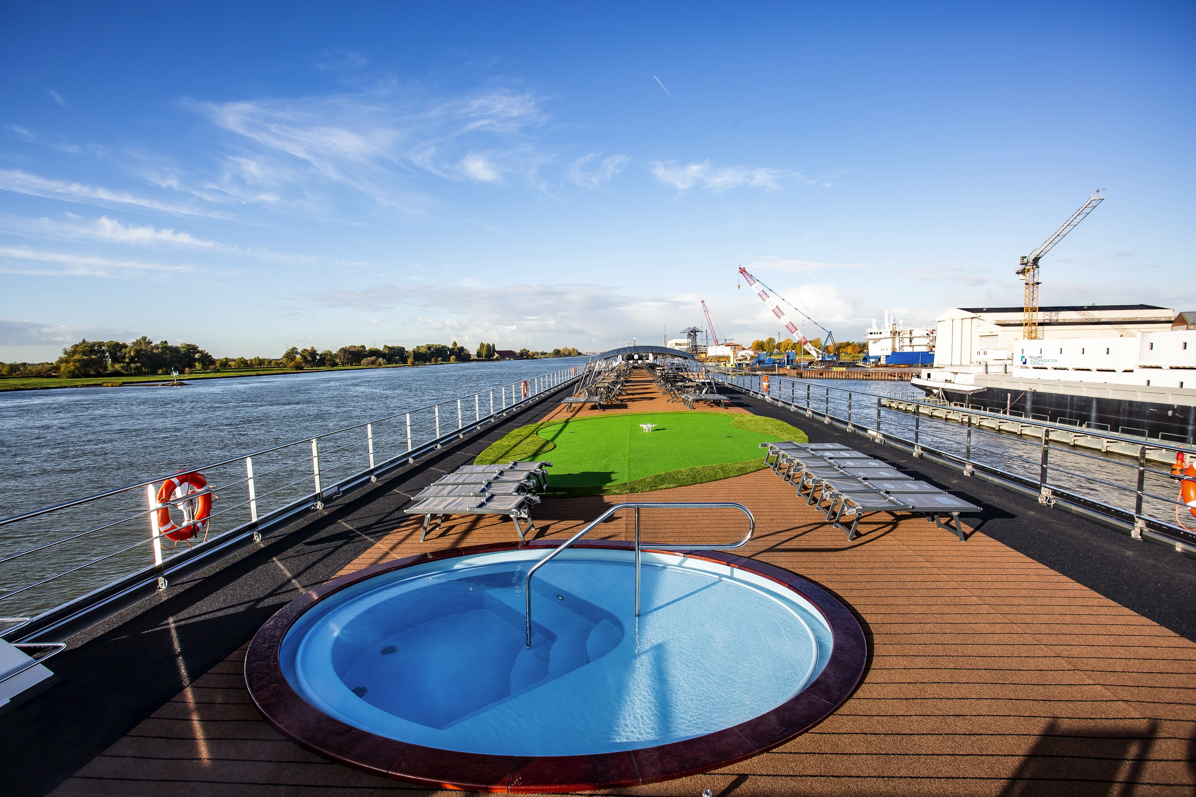 The magnificent and unique Sun Deck illustrates our considered depth of design with a second staircase amidship affording convenient Sun Deck access. Head on up to this truly spectacular deck and what could be better than watching life ashore slip by from the comfort of a sun lounger, perhaps under shade if the weather gets too hot! There’s always the refreshing splash pool too or why not try your hand on the putting green.