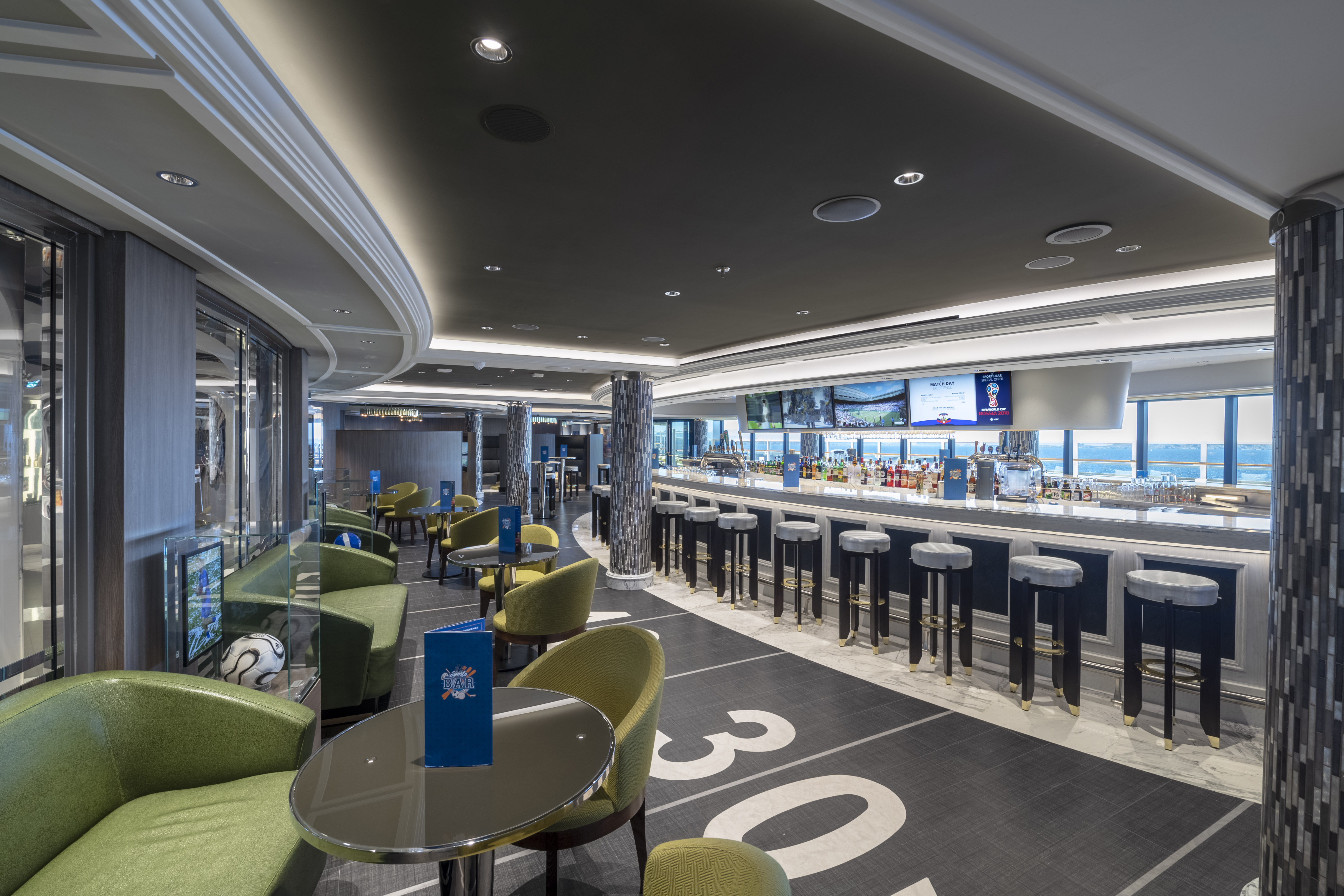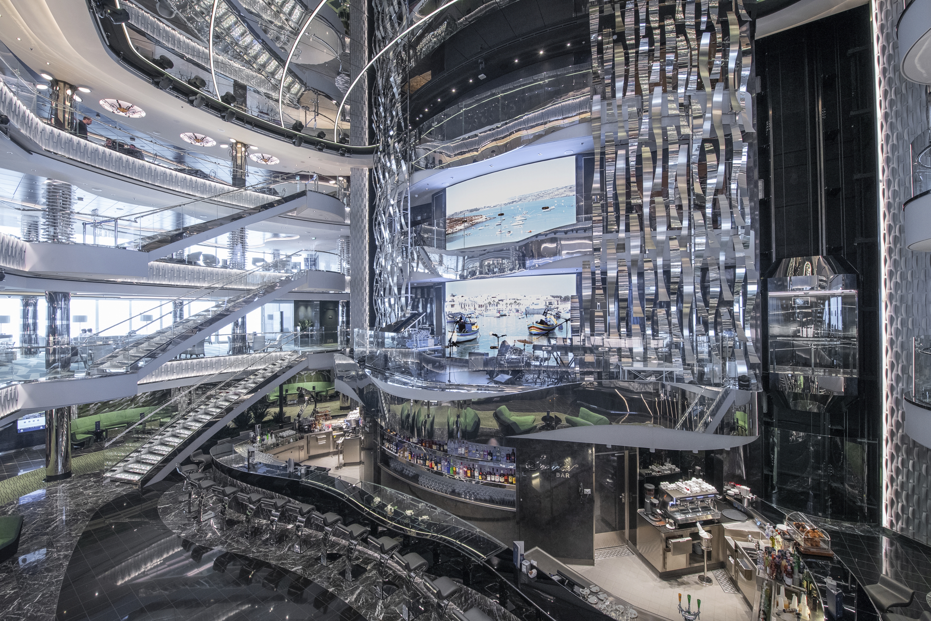 Extending over four decks, the multi-level glass-walled atrium represents an innovative and atmospheric entertainment venue for live music and other events. The two glass-floored catwalks beyond its glass walls offer guests spectacular ocean views.
