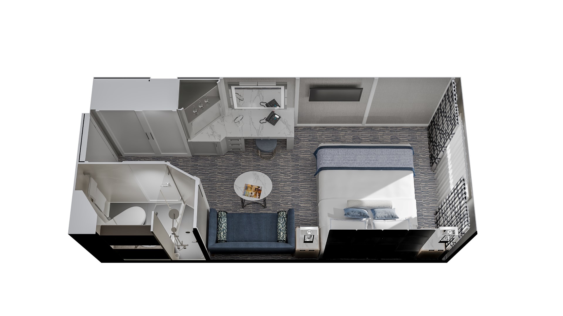 Beautifully re-designed with a modern flair, these delightful private retreats boast 160 square feet of luxury. Highlights include a comfortable seating area, vanity desk, refrigerated mini-bar and plenty of storage. The ingenious use of space is complemented by the re-inspired decor.