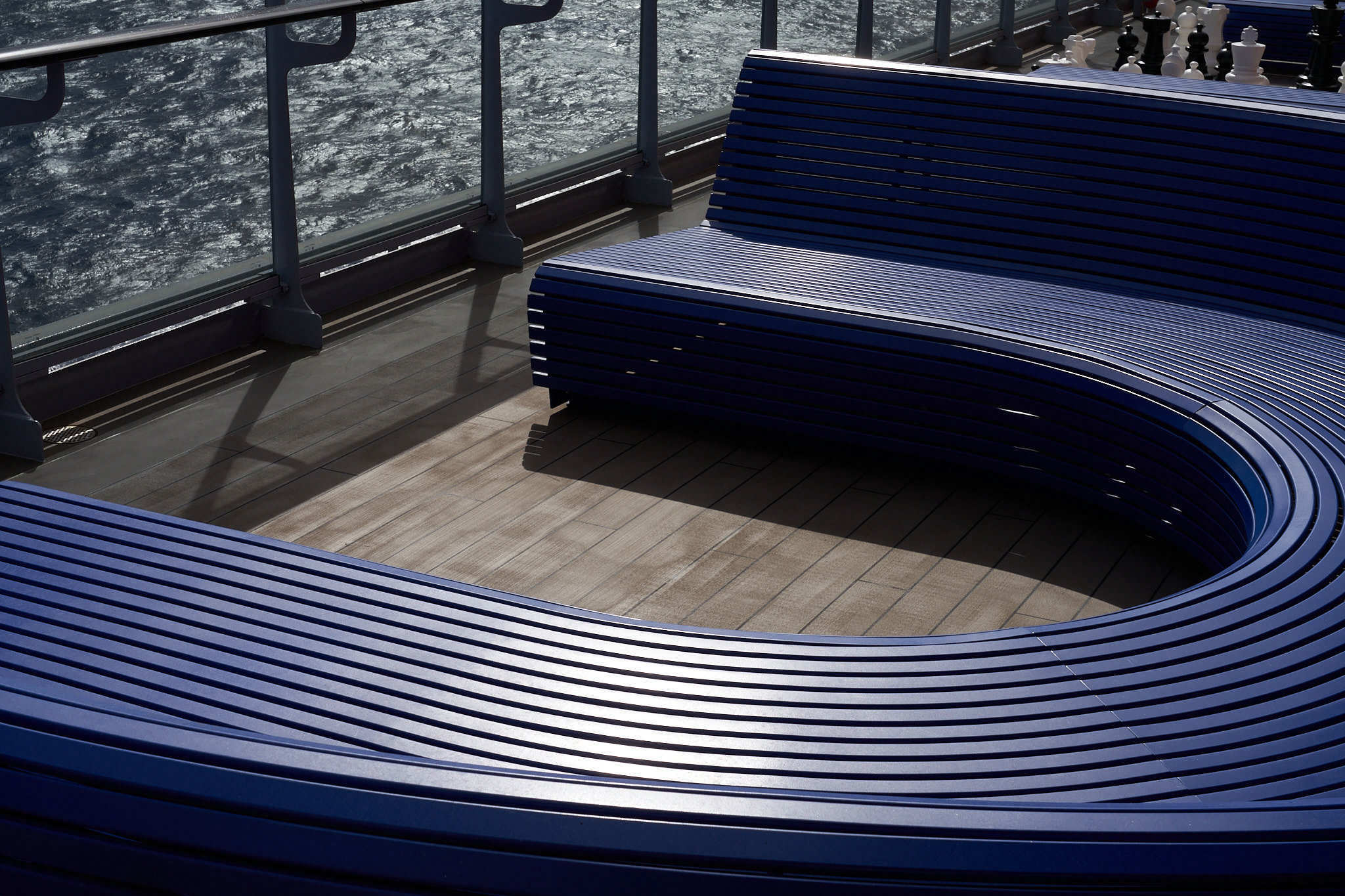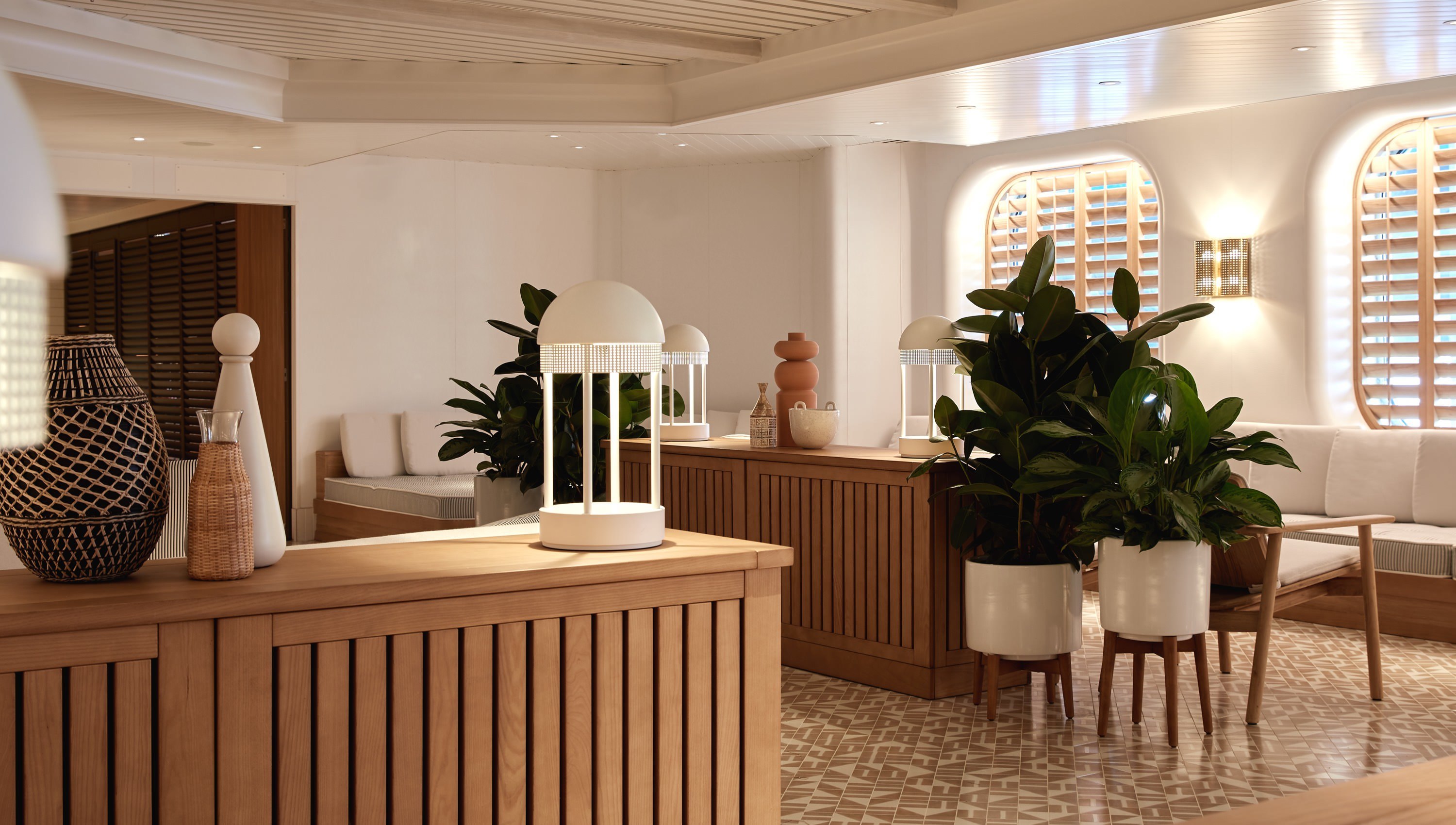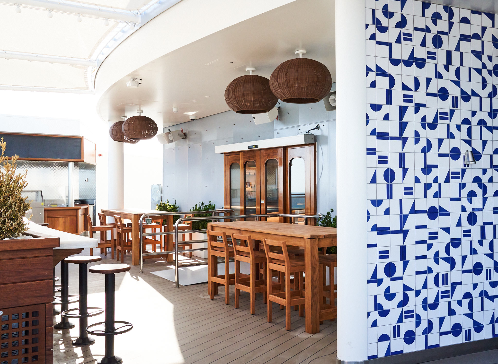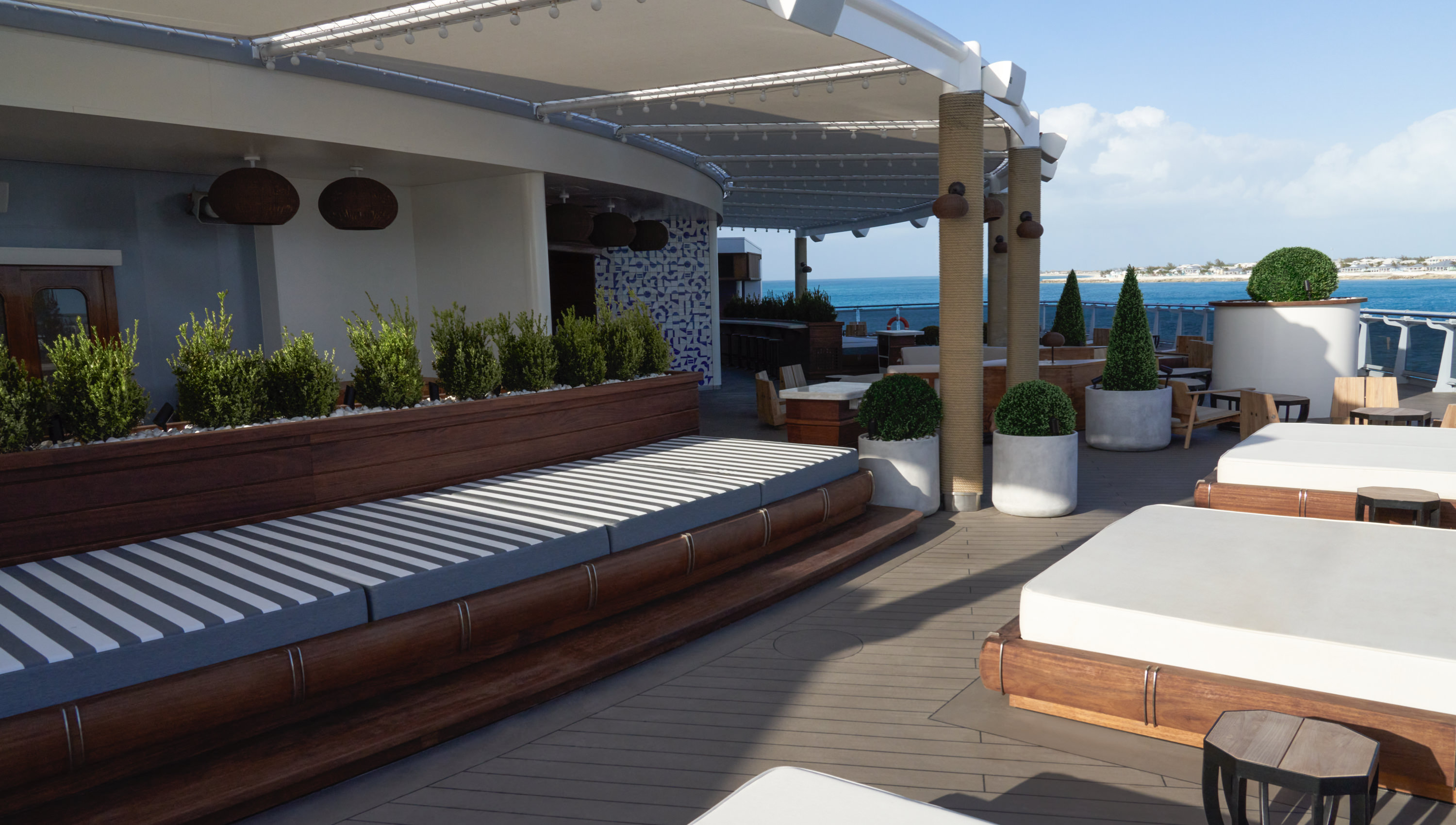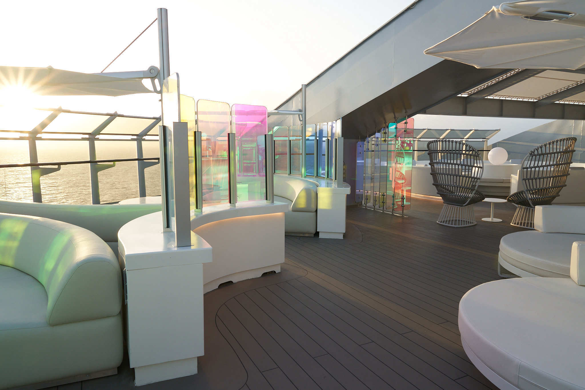 Located at the top of the ship on Deck 17 — right above the Athletic Club — The Perch is our charming and serene outdoor space devoted to the pursuit of Vitamin Sea and personal connection. Every morning starts with sunrise yoga, and when the day draws to a close, The Perch transforms into a space for intimate, social gatherings where you can connect with other Sailors with a sunset backdrop and a glass of champagne.